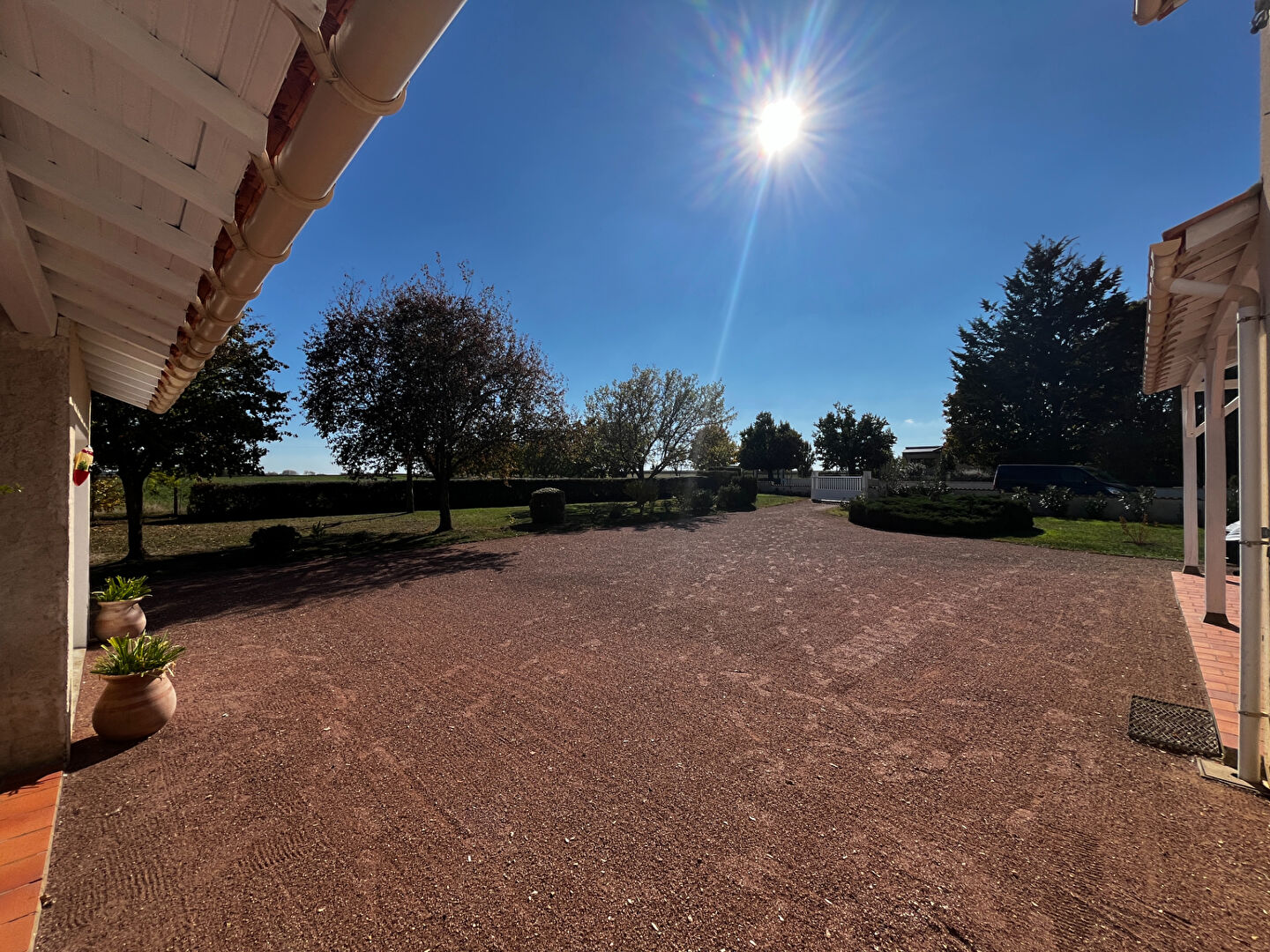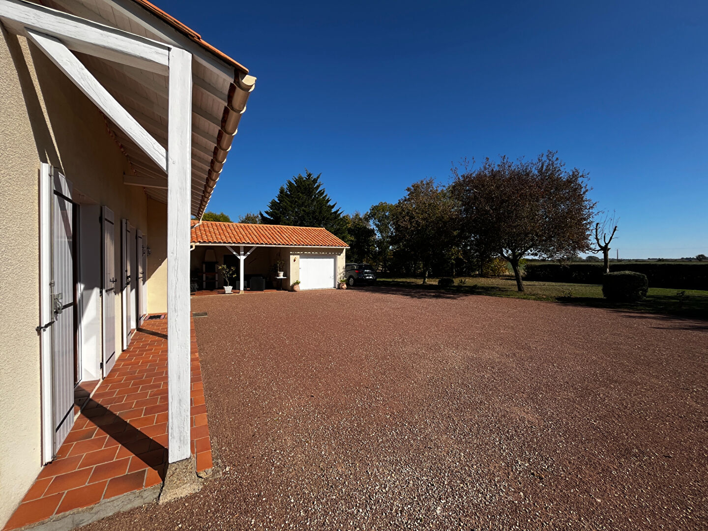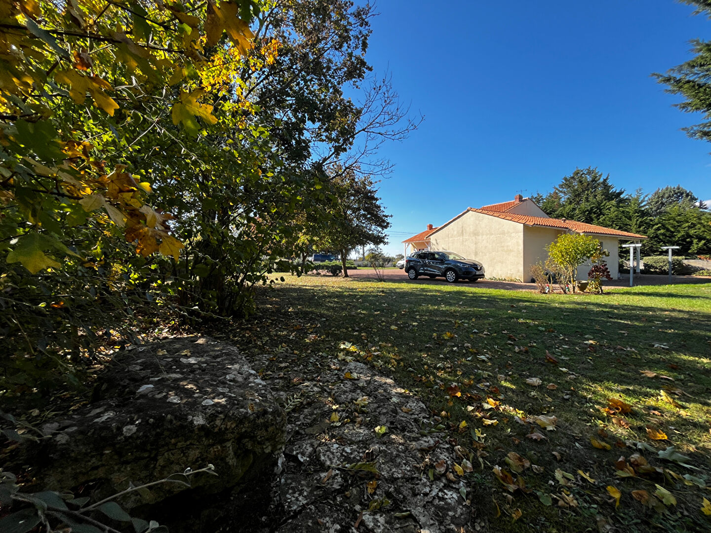 Le terrain de 2400 m² est entièrement clos et sans vis-à-vis, ouvert sur la nature et arboré.