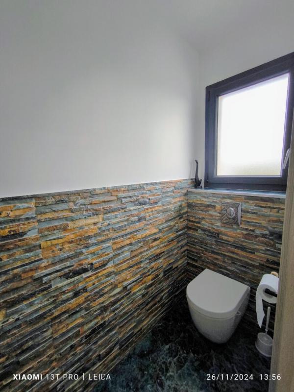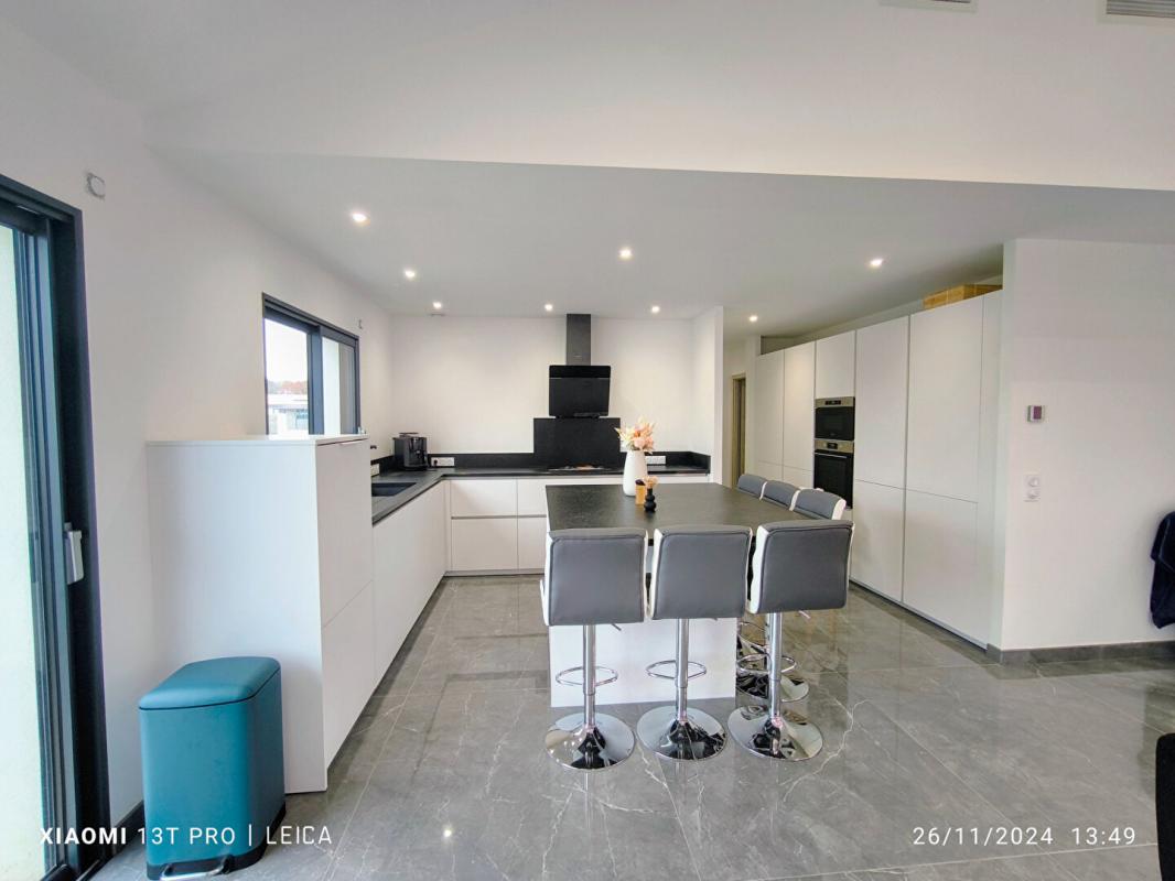 Dès l'entrée vous serez sous le charme avec son carrelage de 120 X 120 en marbre gris avec son grand placard et le premier wc, suivi d'un cellier, puis vous trouverez une grande pièce de vie avec son plafond cathédrale baignée de lumière avec sa cuisine équipée ouverte.