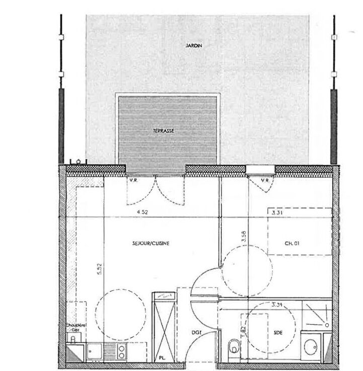 Appartement T2 à Guérande, à deux pas des Salines et de la gare de la Baule Escoublac dans une copropriété de 2013, au rez-de-chaussée, comprenant : une entrée, un séjour-cuisine, une chambre, une salle d'eau avec W.C. Une terrasse et un jardin privatif.