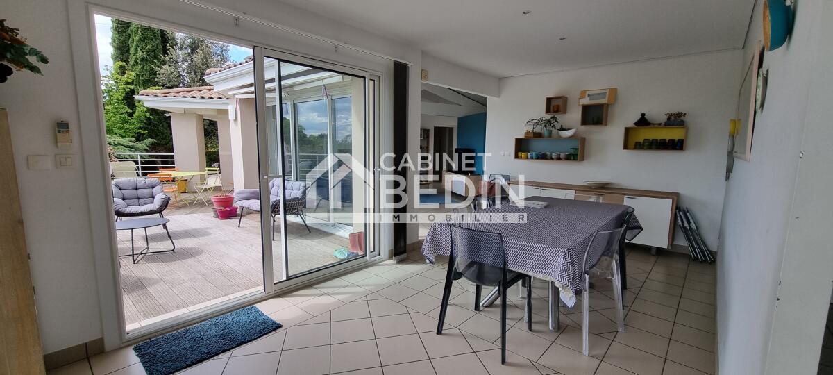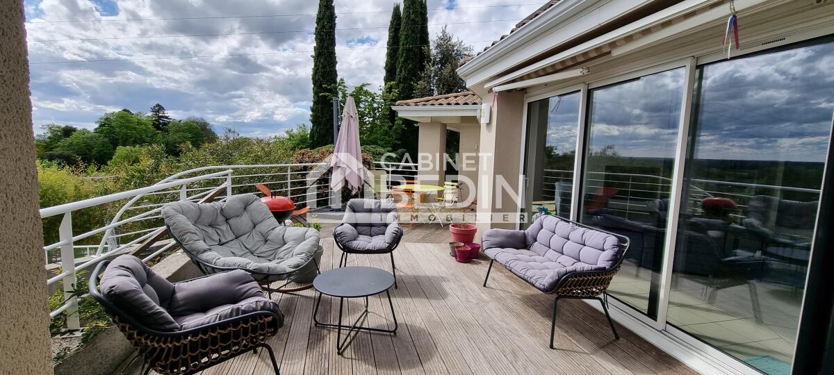 Terrasse exposée plein sud avec vue dégagée sur la Garonne. Piscine chauffée, idéale pour en profiter une grande partie de l?année. Boulodrome, abri de jardin, terrain clos pour la sécurité des enfants.