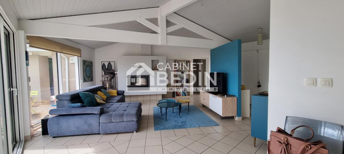 Cuisine aménagée et équipée, ouverte sur un espace de vie lumineux avec cheminée pour des moments chaleureux.