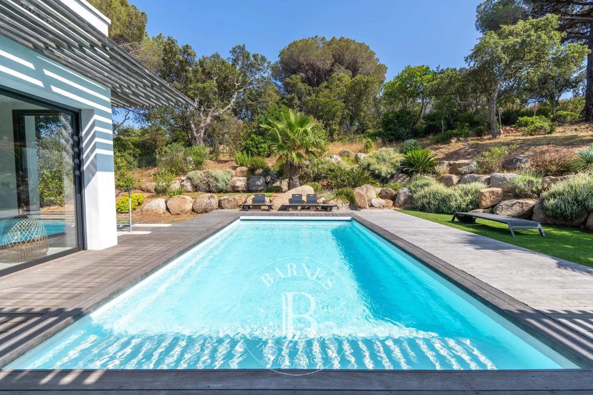 Édifiée sur un terrain arboré d’environ 1 800 m², agrémenté d’enrochements naturels et une piscine.