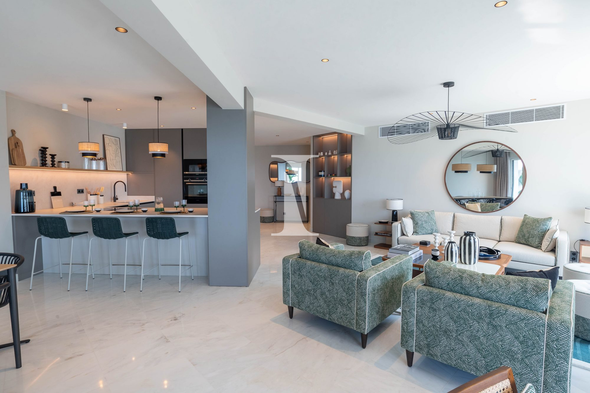 un coin salle à manger, un coin salon donnant sur balcon vue mer , deux chambres avec une salle de douches et wc une chambre de Maître avec wc salle de douches et baignoire avec fenêtre, de nombreux dressings