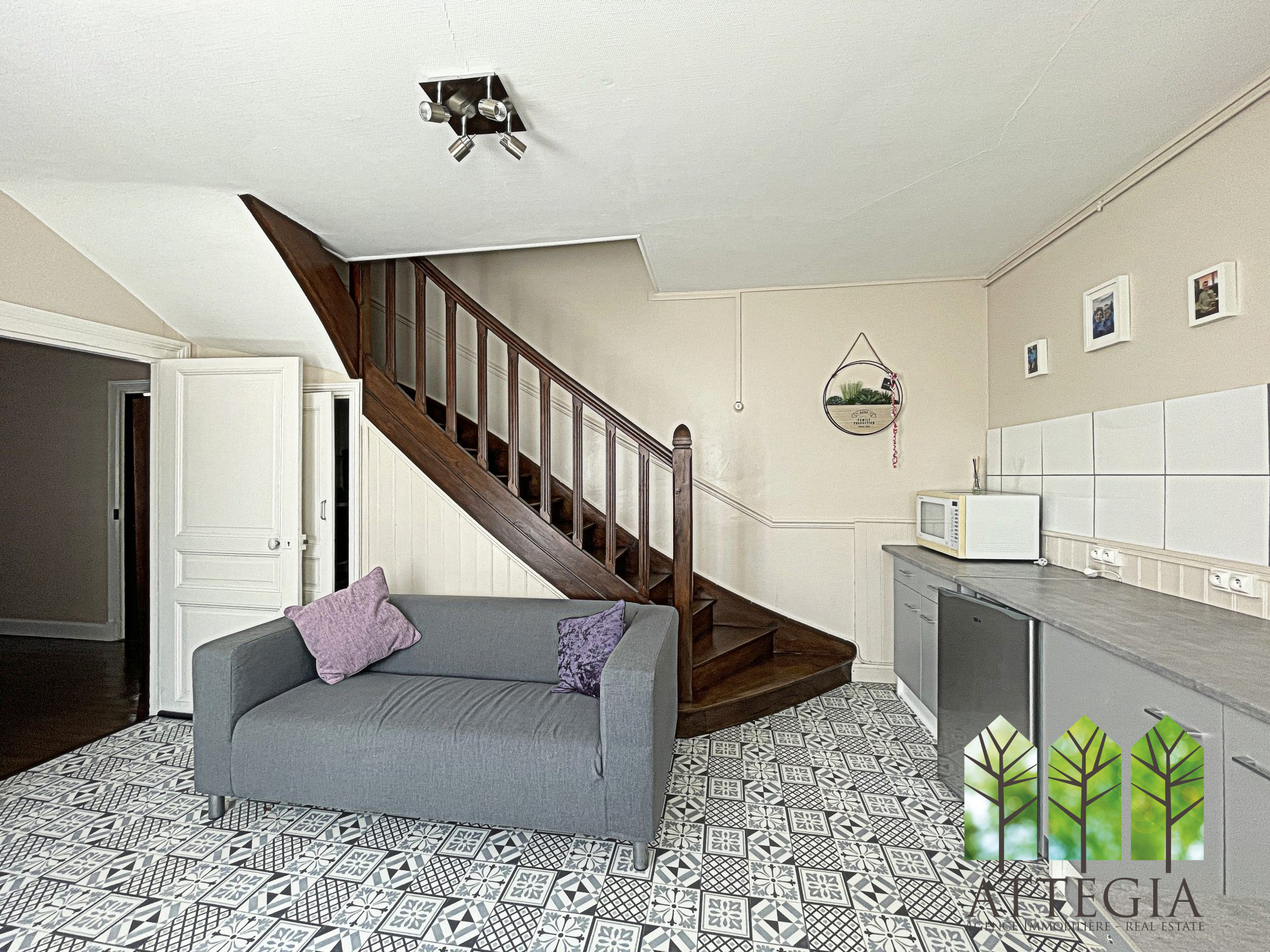 Sur la droite, un salon chaleureux de 17 m² orné de boiseries et d'une cheminée avec petit poêle, mène, via quelques marches, à une salle à manger de 14 m², puis à une cuisine de 16 m². À l'étage, deux chambres de 10 et 14 m² avec parquets anciens et cheminées, ainsi qu'une salle d'eau avec WC.