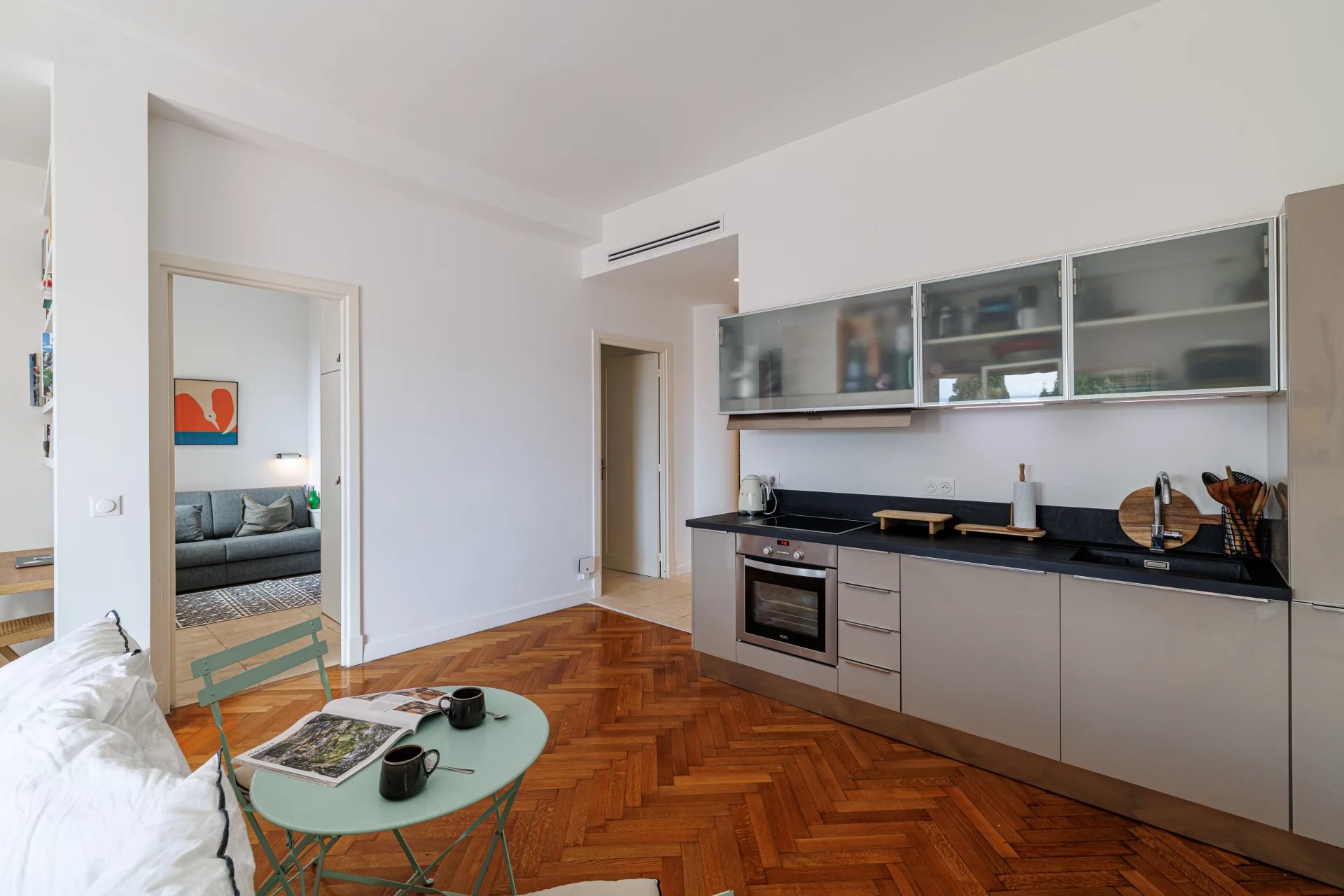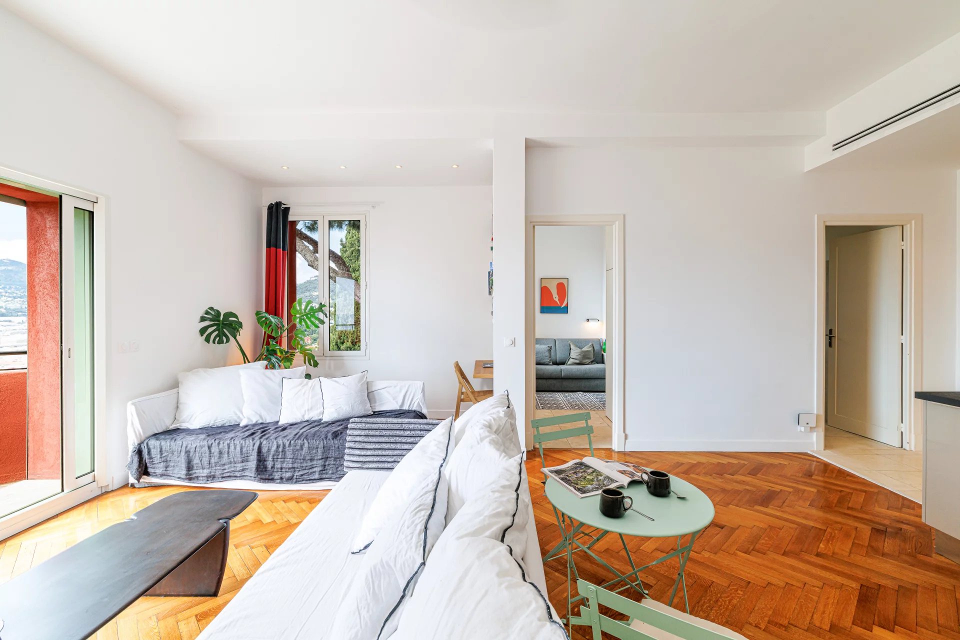 À la lisière du parc forestier du Mont Boron, cet appartement avec une spacieuse chambre et un coin nuit, en excellent état, est niché au sein d’une maison datant des années 1930, divisée en appartements. Situé dans une petite copropriété intimiste de seulement quatre lots, il bénéficie d’un environnement privilégié, au calme, avec une vue panoramique imprenable sur la mer et le port de Nice, grâce à son exposition sud-ouest.