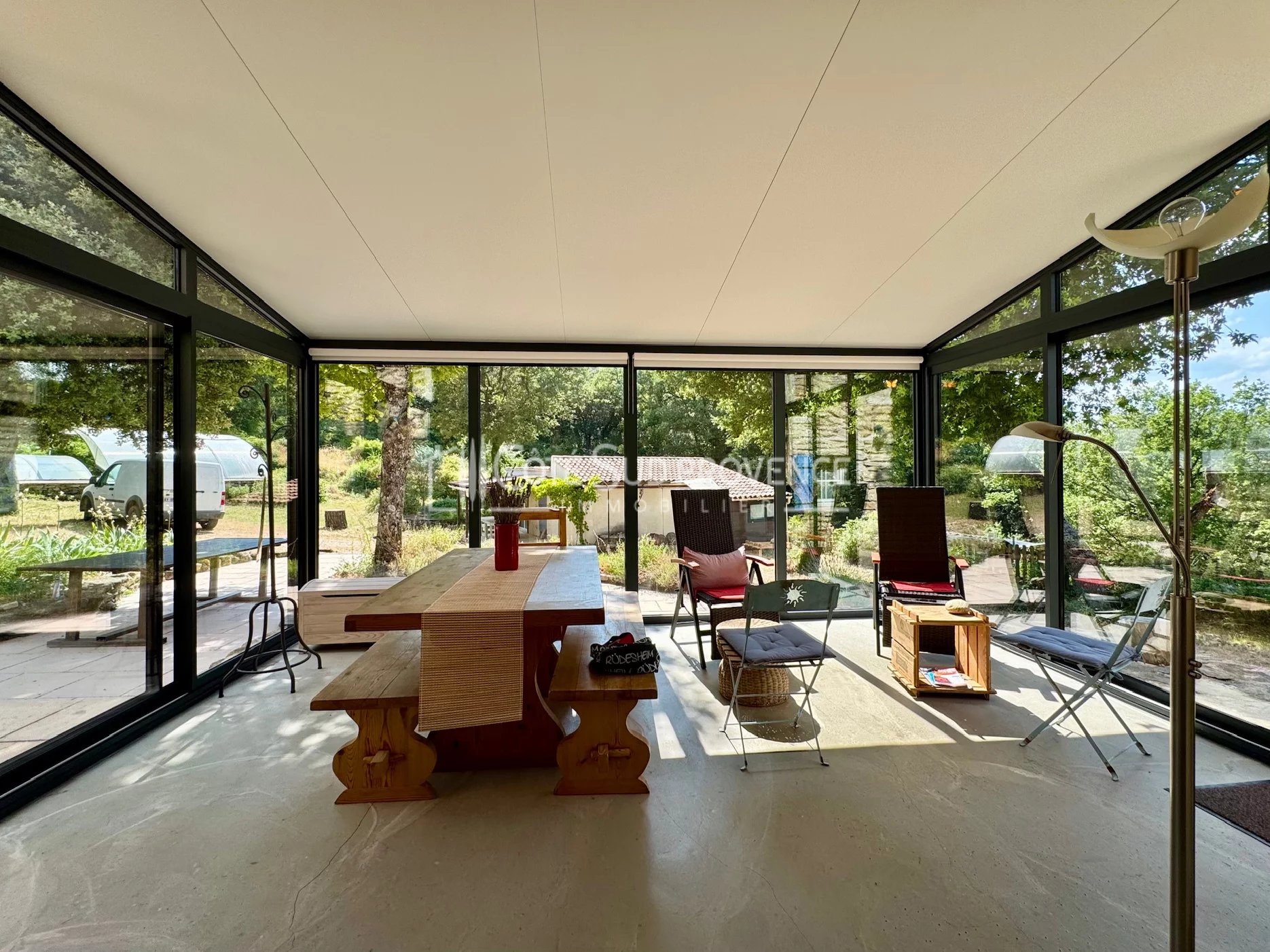 Au calme absolu en position dominante, Mazet d'environ 110 m² sur deux niveaux avec dépendances et piscine liner de formes libres.