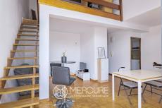L’entrée ouvre sur une cuisine indépendante, un séjour lumineux prolongé par un balcon agréable, ainsi qu’une salle de bains avec toilettes. Une rochelle à l’esthétique sobre et contemporaine accueille une grande chambre en mezzanine, créant un espace nuit distinct tout en préservant la belle hauteur sous plafond et la circulation de la lumière.