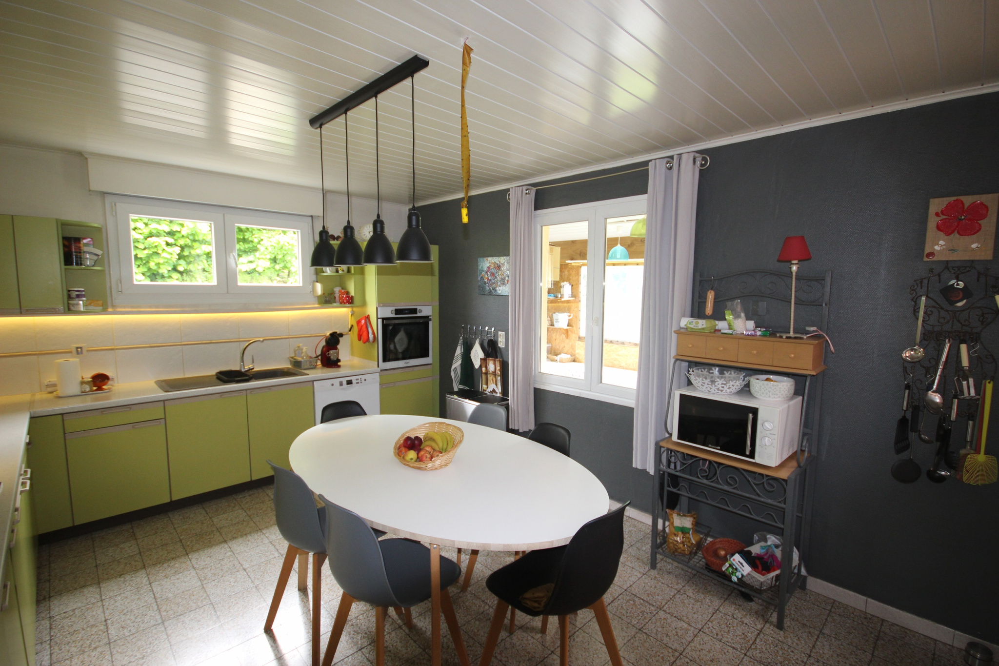 - au rdc: un hall d'entrée qui dessert un salon, une salle à manger, une cuisine équipée, un wc et une véranda (avec sa cuisine d'été), une chambre avec mezzanine.