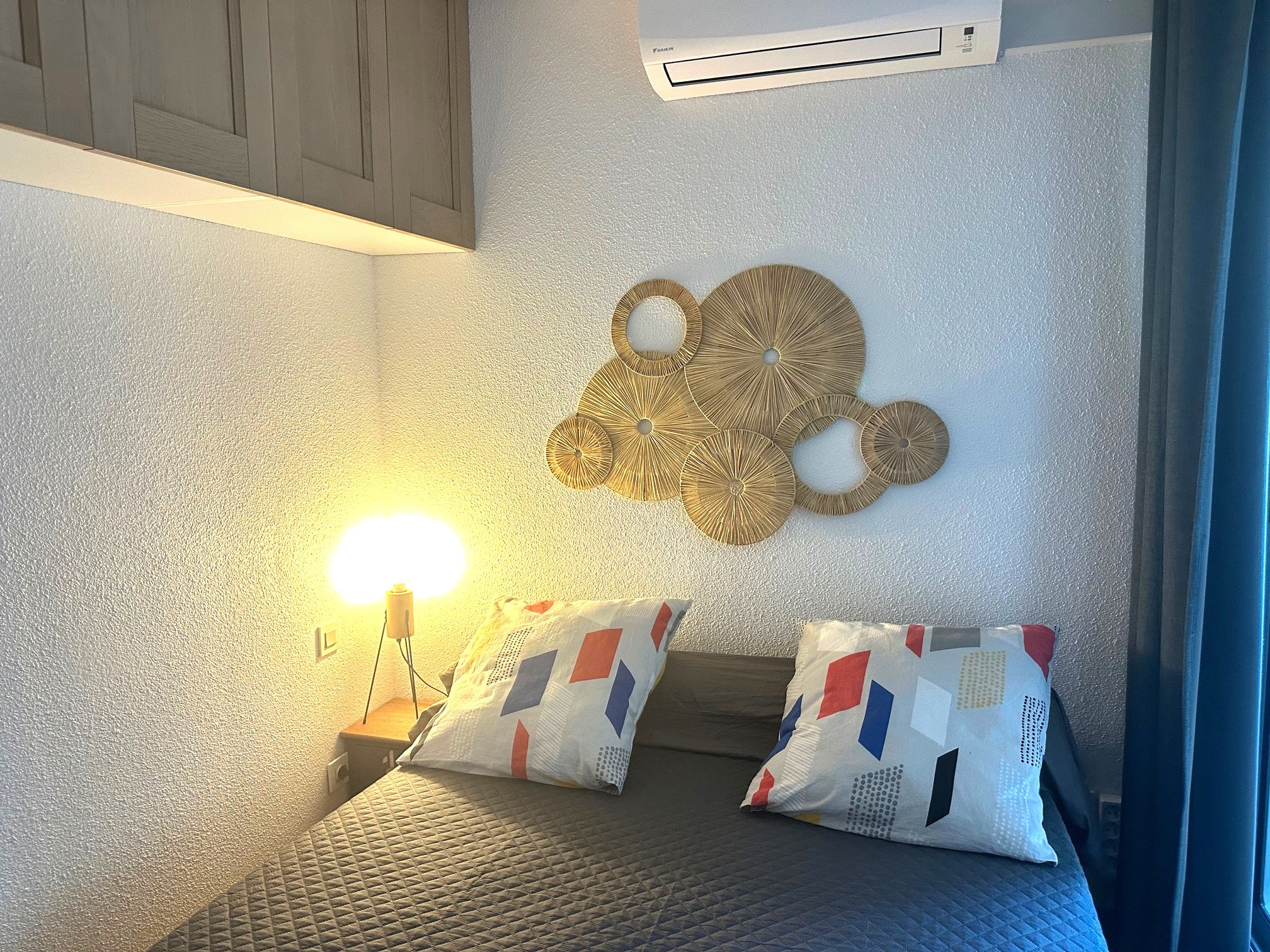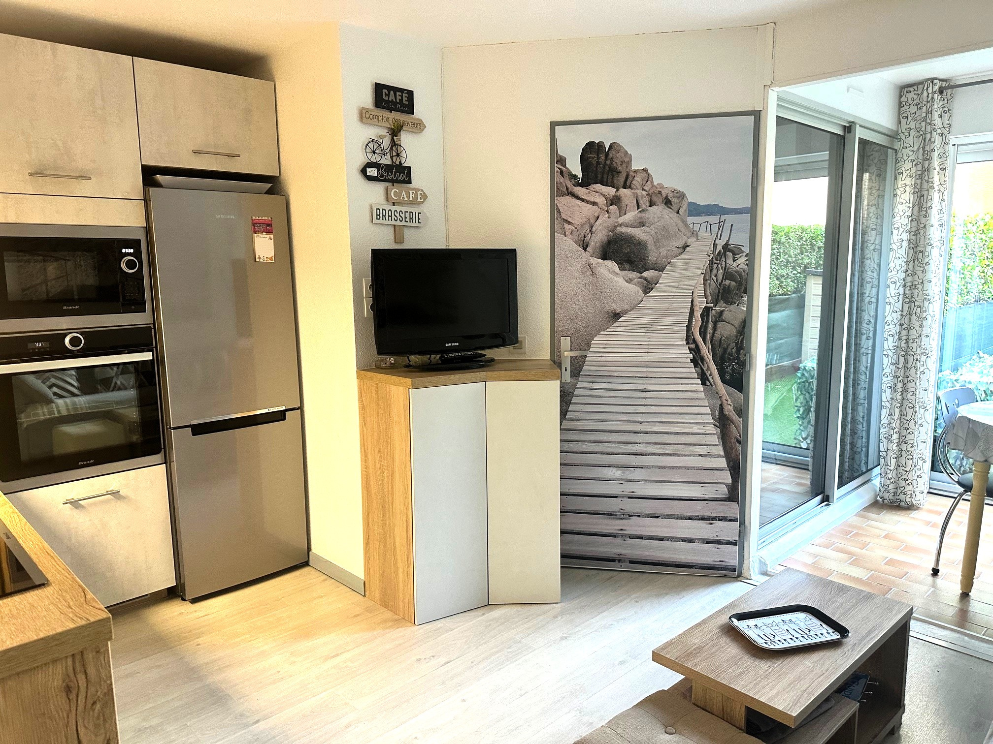 A Vendre Dans agréable Résidence Arborée et Sécurisée et a deux pas du Centre Commercial et de la Plage, Appartement T2 en Rez de Jardin entièrement rénové avec Gout, comprenant séjour cuisine, une chambre, SDE, WC, loggia, Jolie Terrasse Exposée Sud. Parking privé. Climatisation Réversible. Vendu Meublé