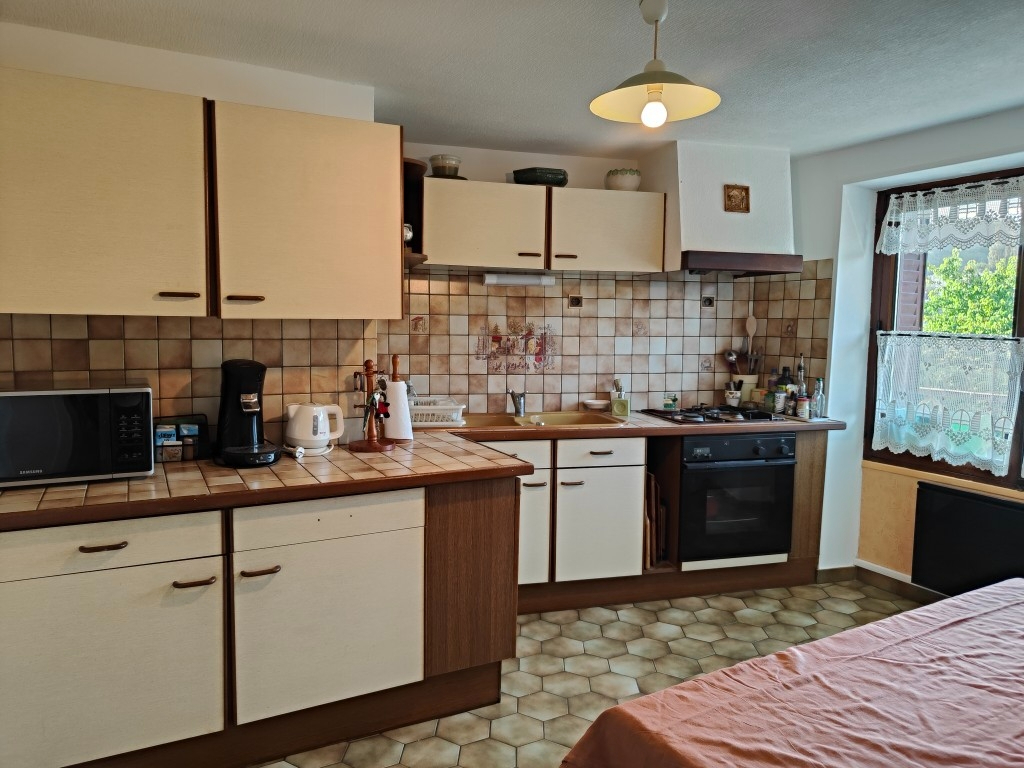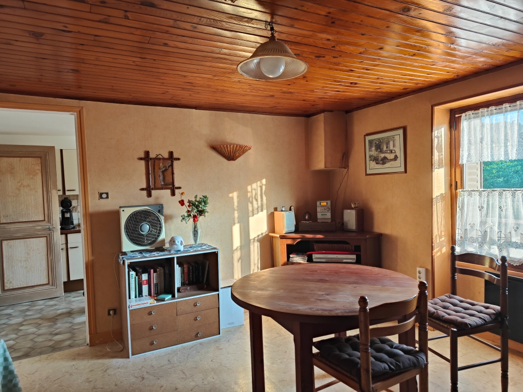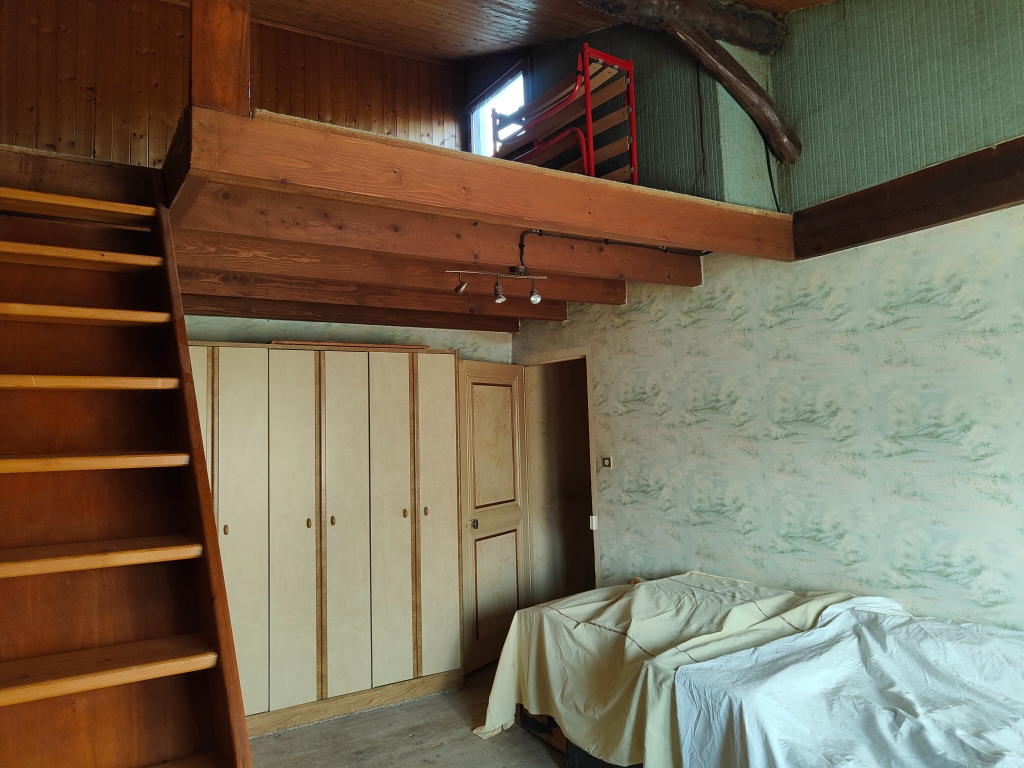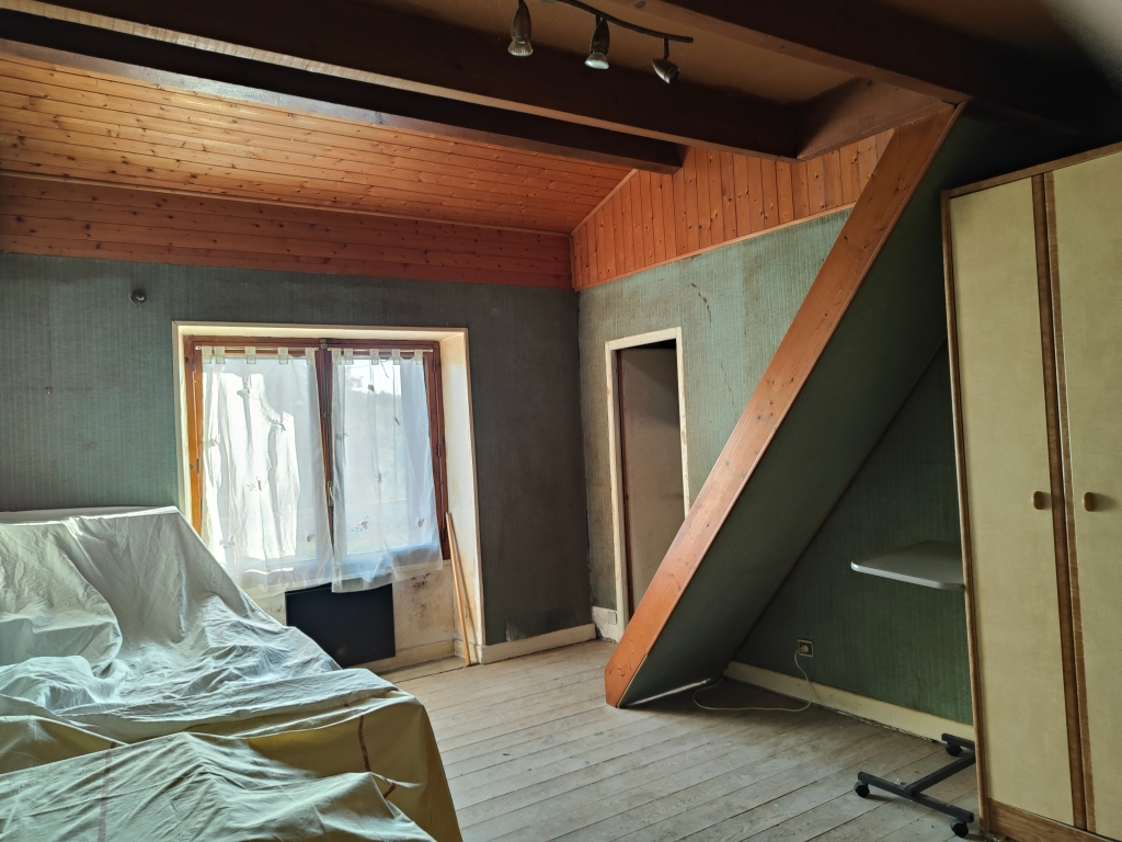 La deuxième partie, au premier étage se compose d'un appartement desservant une cuisine indépendante, un salon, deux pièces en soupente et une chambre avec un espace mezzanine. Salle de bains et wc individuel. Le tout à rafraichir.