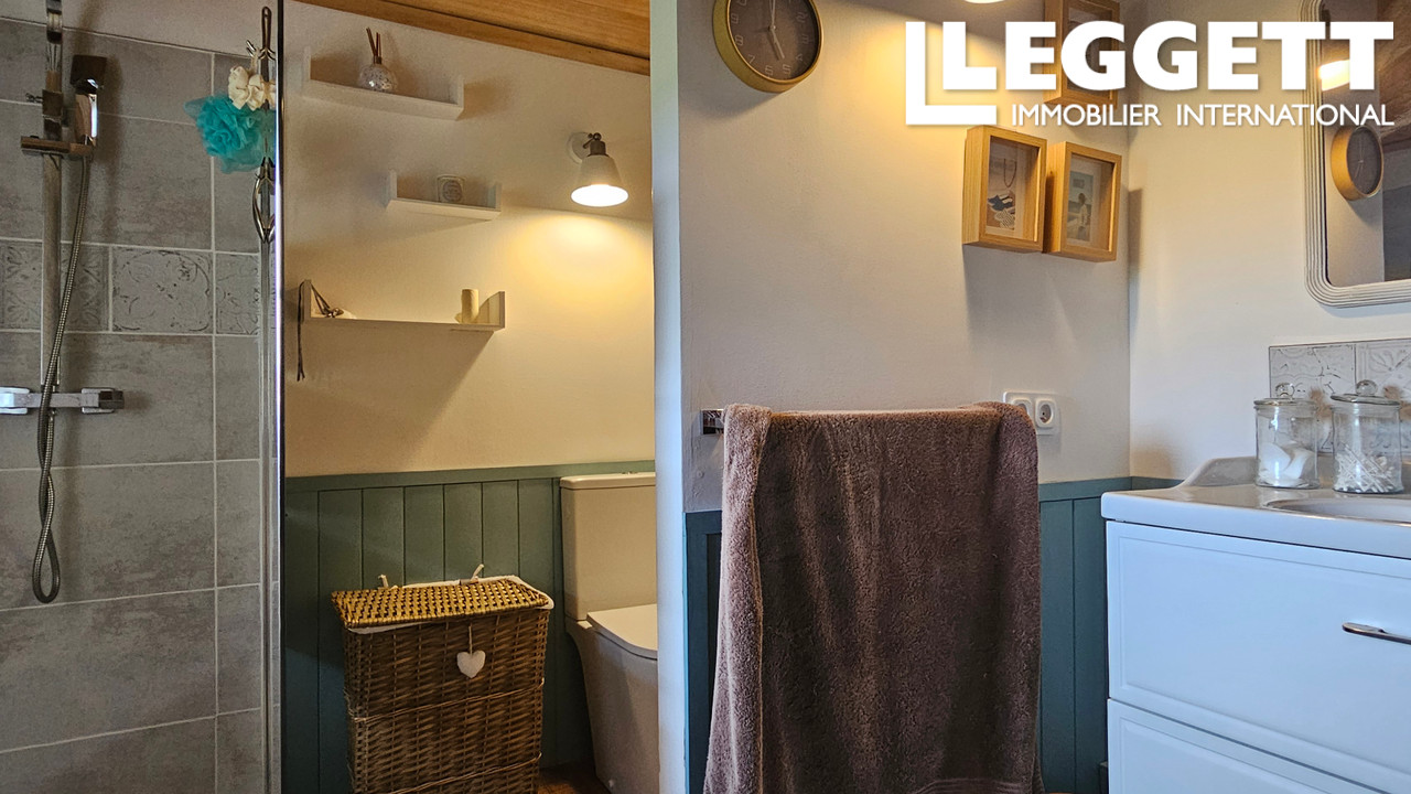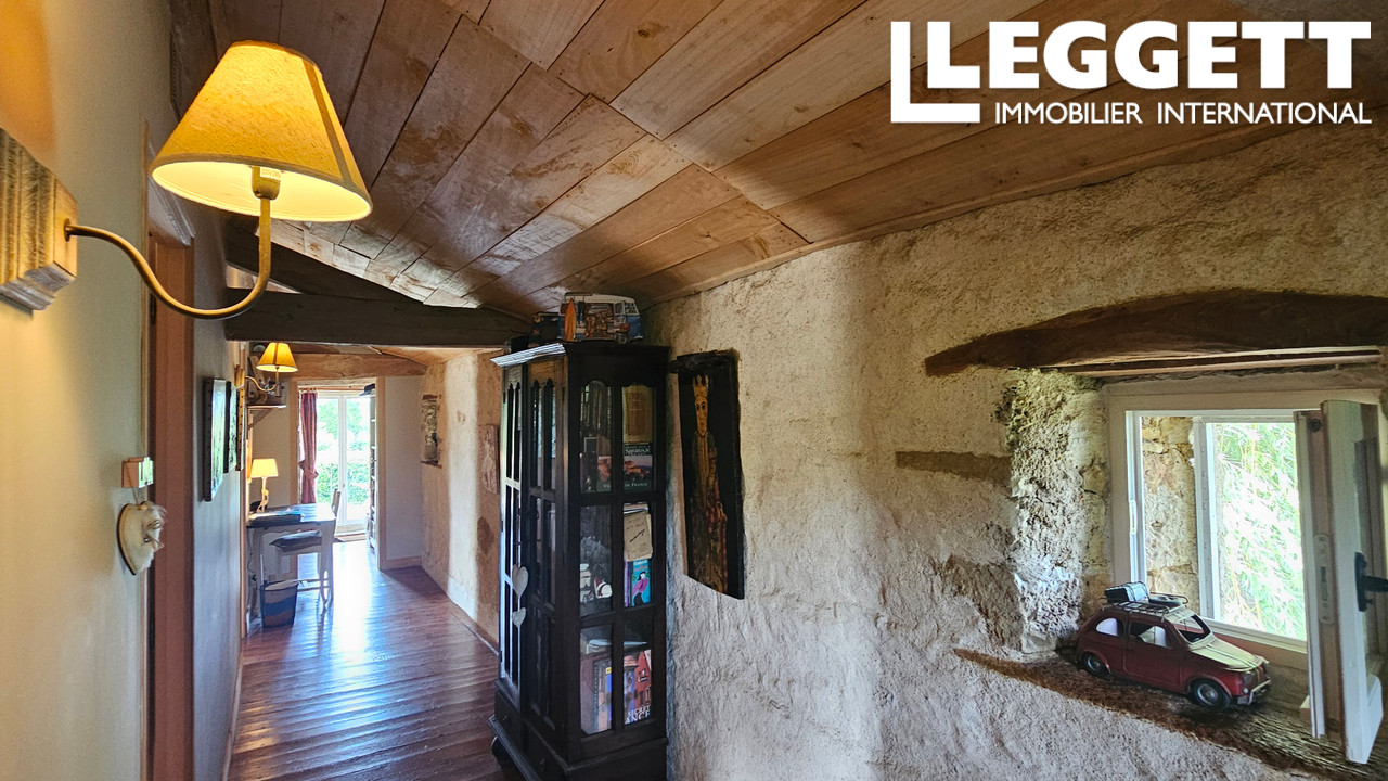 La maison se compose au rez-de-chaussée d'une cuisine/salle à manger avec un poêle à bois et un WC, un séjour avec cheminée ouverte avec accès à la cour et à la terrasse. A l'étage, un palier avec espace bureau offrant trois chambres, une salle d'eau avec WC et un accès à l'extérieur par un escalier en pierre.
