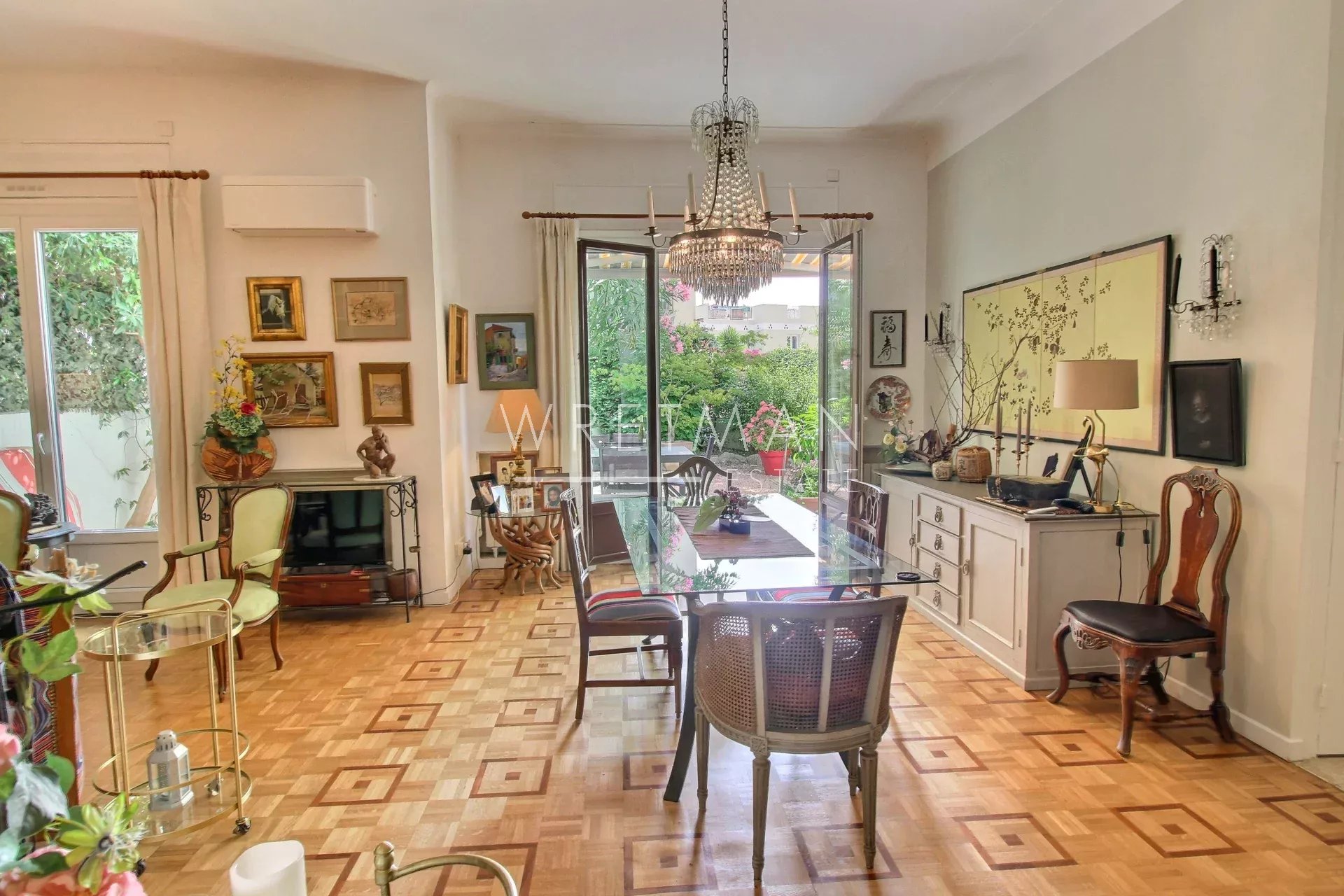 L'appartement dispose de deux chambres, chacune avec accès direct sur un deuxième jardin et terrasse privée. Vous apprécierez les deux terrasses ensoleillées en orientation sud-est, nord-ouest, ombragées par de la verdure.
