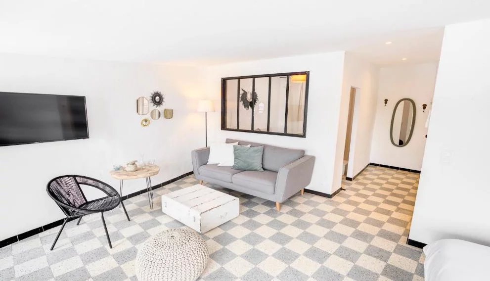 Vous allez trouver en RDC attenant, un 2 pièces comprenant une salle a manger, une cuisine, un coin nuit, une douche et un WC séparé.