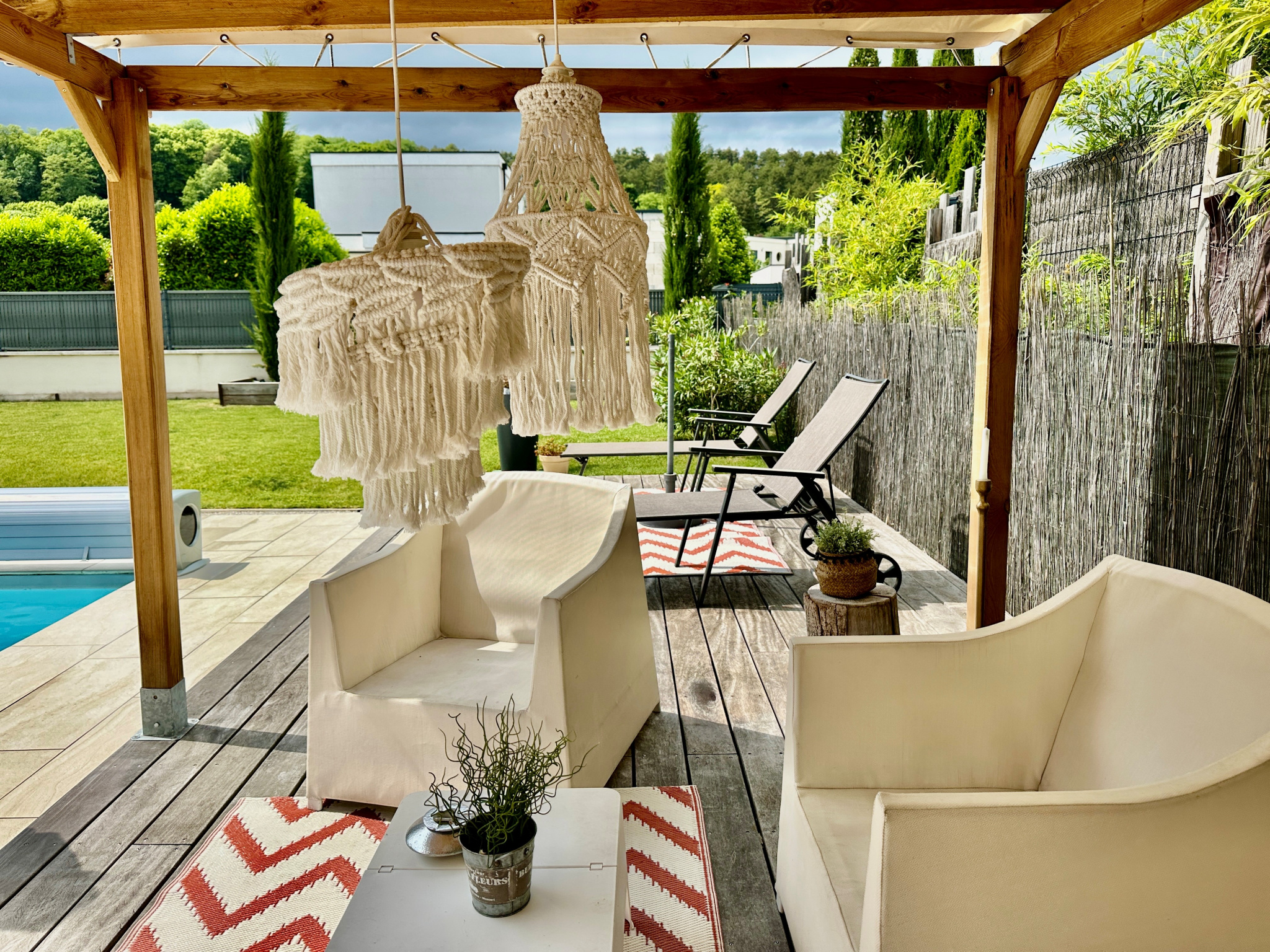 Dès l'entrée, vous serez séduit par les volumes et la luminosité du vaste salon-séjour traversant, ouvert sur le jardin paysager et la piscine.