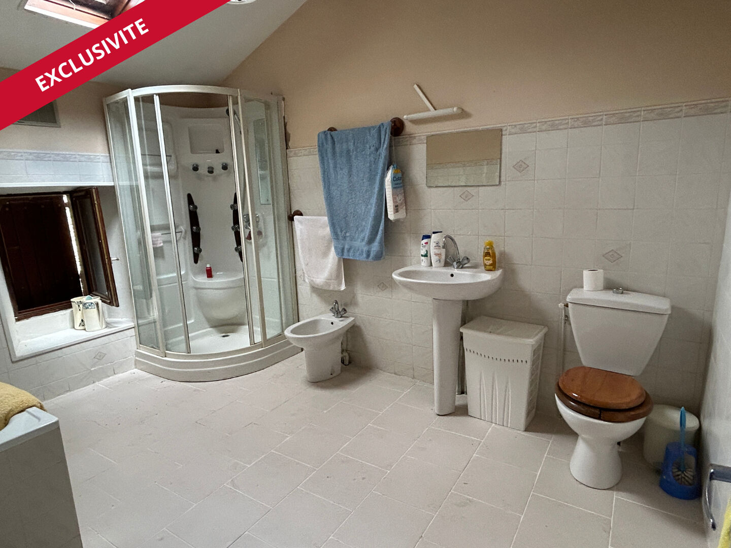 Au premier étage deux chambres traversantes, une grande salle de bains (baignoire et douche) et WC.