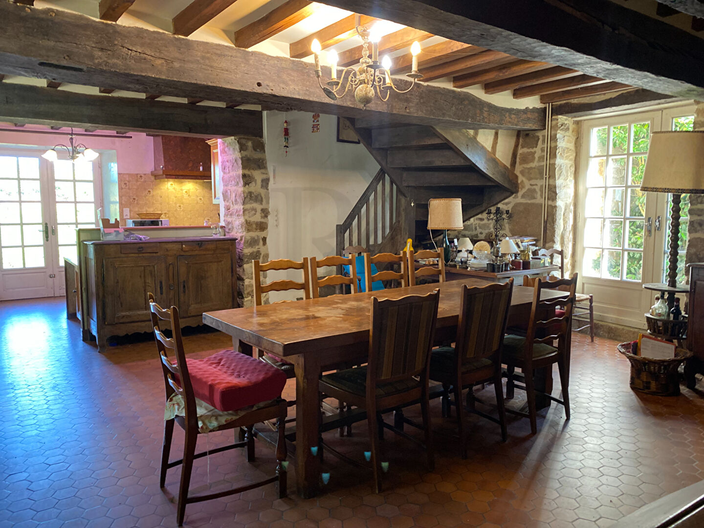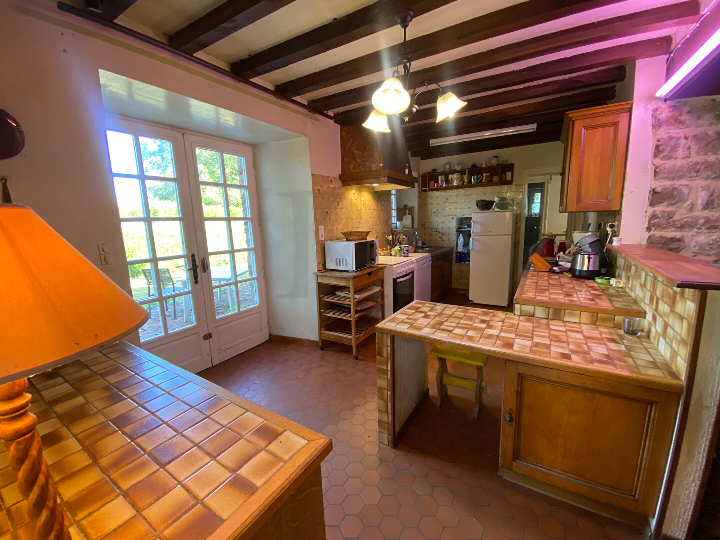La maison se compose au RDC d'un séjour et d'un salon avec chacun un poêle à bois, cuisine aménagée avec accès terrasse, une chambre, salle de bains, buanderie et WC, pratique et confortable pour une vie de plain-pied.