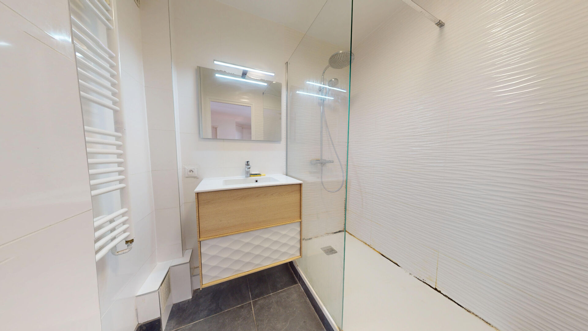Salle d'eau rénovée avec douche à l'italienne (carrelage 3D), meuble vasque, sèche-serviette, carrelage noir au sol.