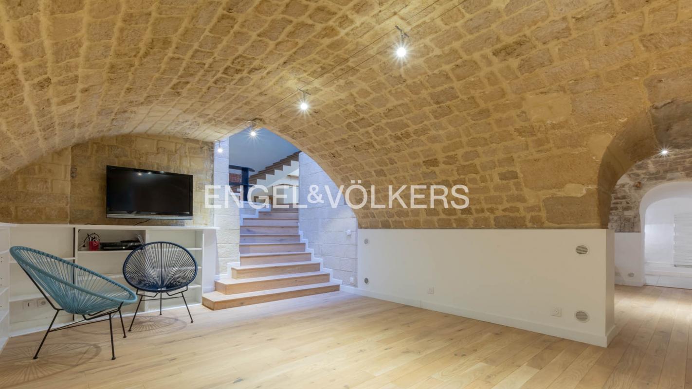 Dans les caves voûtées aménagées avec ambiance charmante et cosy: une grande chambre de 23m² (et sa lumière naturelle) avec spacieuse salle de bain adjacente, salle de jeux, deux bureaux et une buanderie.