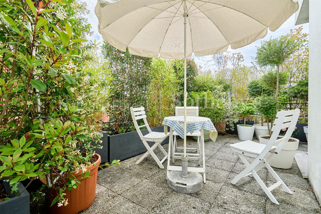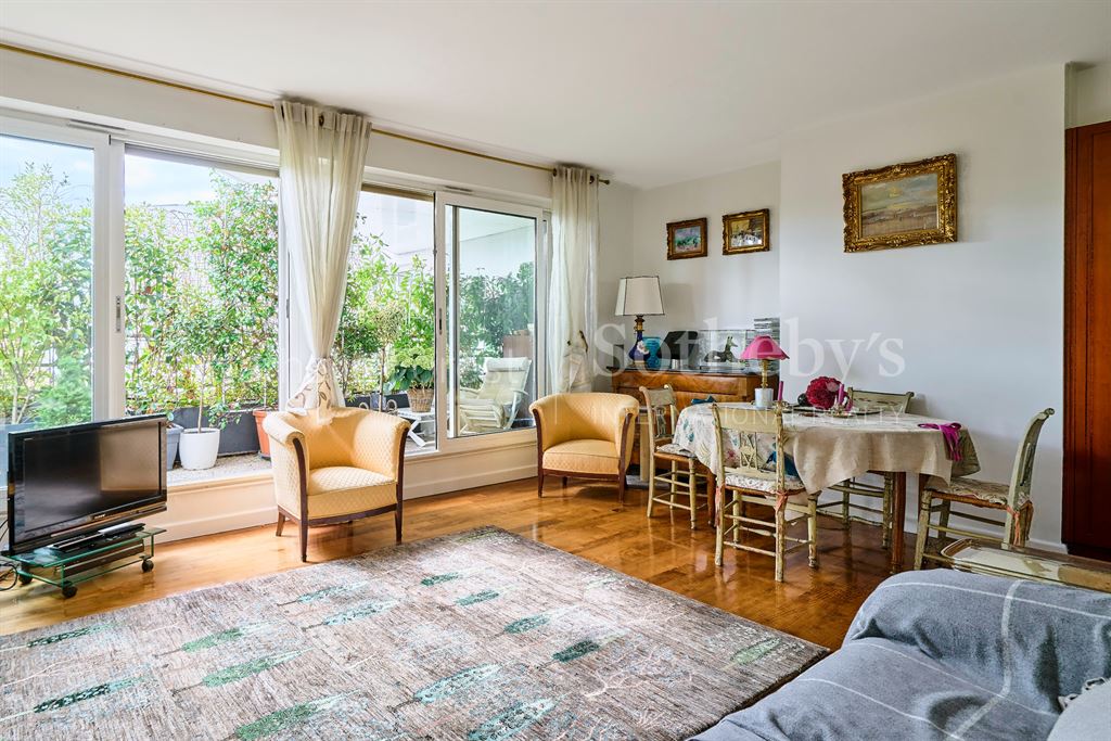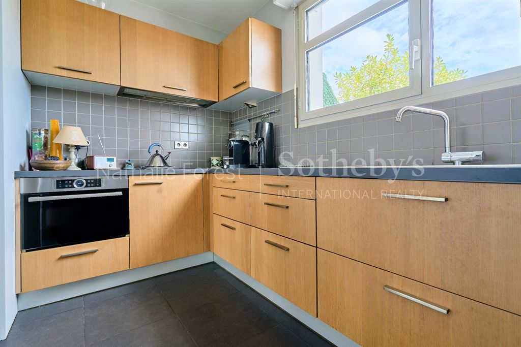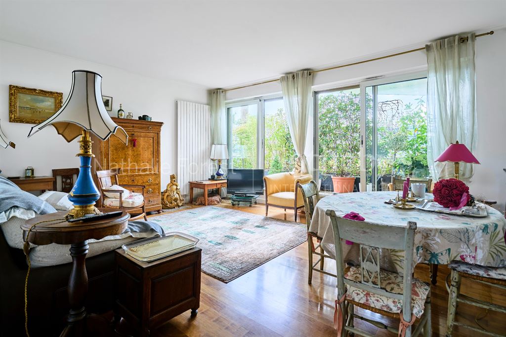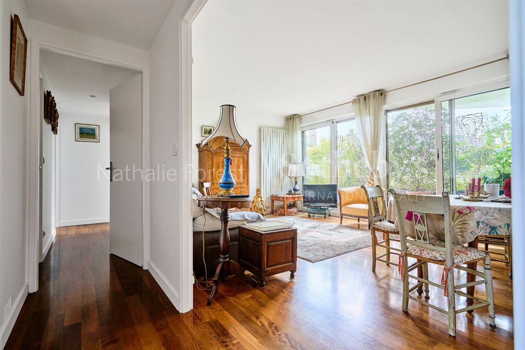 Le séjour de 26 m², entièrement repeint, est sublimé par un parquet en bois exotique et de larges baies vitrées ouvrant sur la terrasse. La cuisine, sobre et élégante, marie le granit à des tons de bois clair, pour une ambiance chaleureuse et contemporaine.