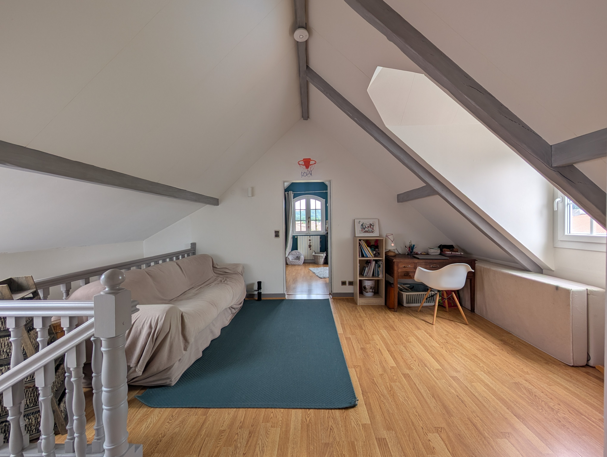 Un escalier vous mène à l'étage où vous trouverez un grand palier pouvant faire office de bureau distribuant deux chambres spacieuses ainsi qu'un second toilette et une salle de bain.