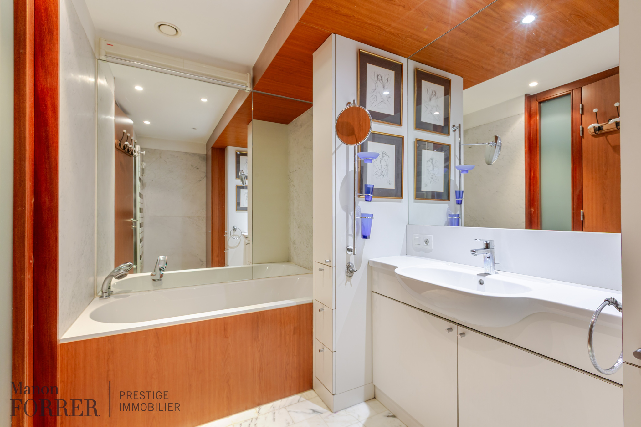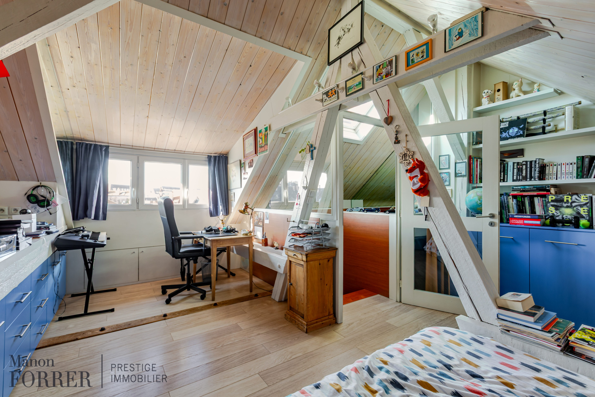 Très lumineux, ce bien exposé Est Ouest et traversant se compose au premier niveau d'une vaste entrée avec rangements, d'un agréable séjour avec bibliothèque sur mesure, d'une cuisine équipée avec salle à manger ouvrant sur un balcon filant et d'un WC invités. Aux niveaux supérieurs, un grand palier pouvant être aménagé en salon de lecture ouvrant sur la terrasse vue Cathédrale, 4 chambres dont une parentale avec balcon filant, deux salles d'eau, une salle de bain et un WC séparé.