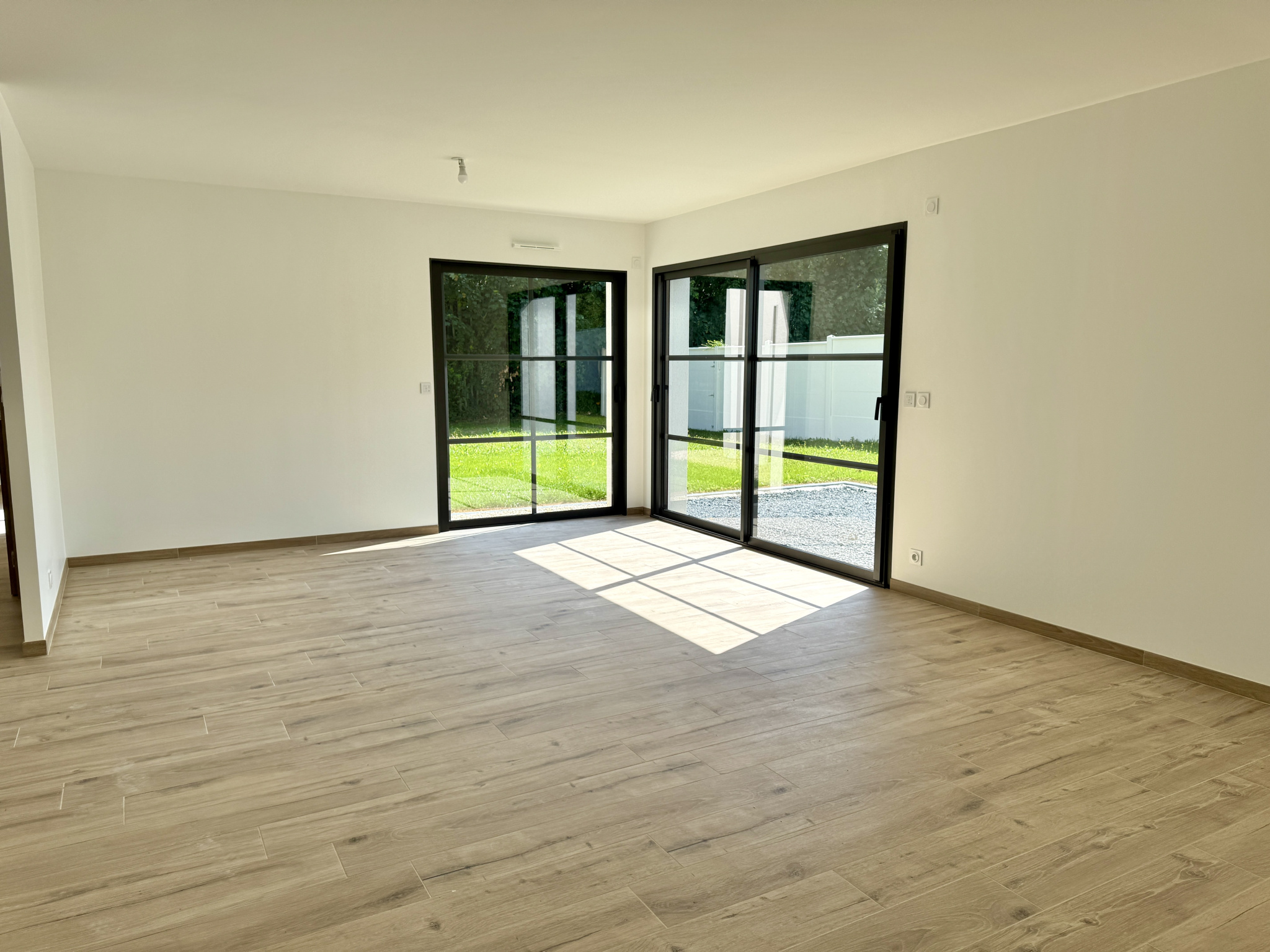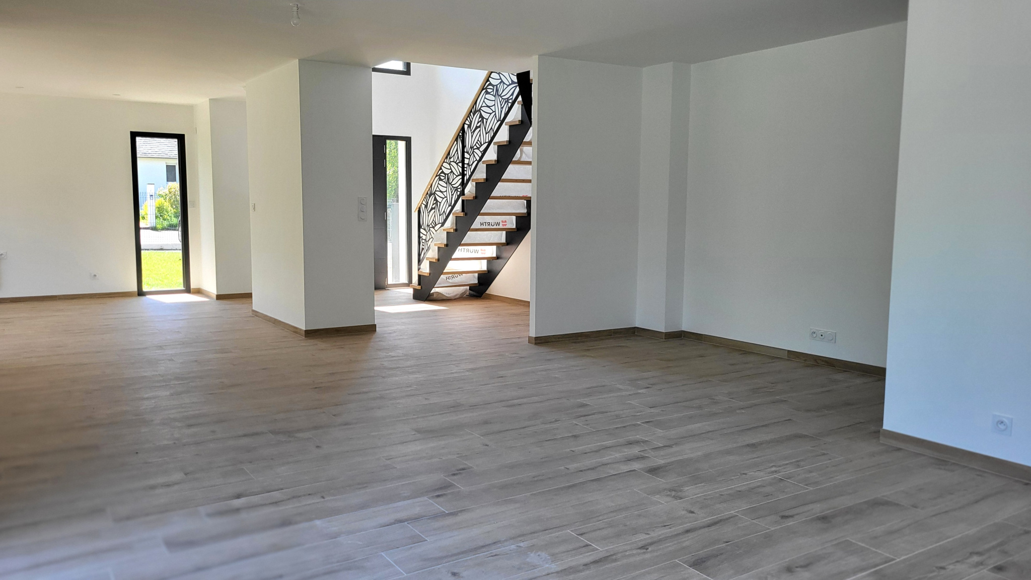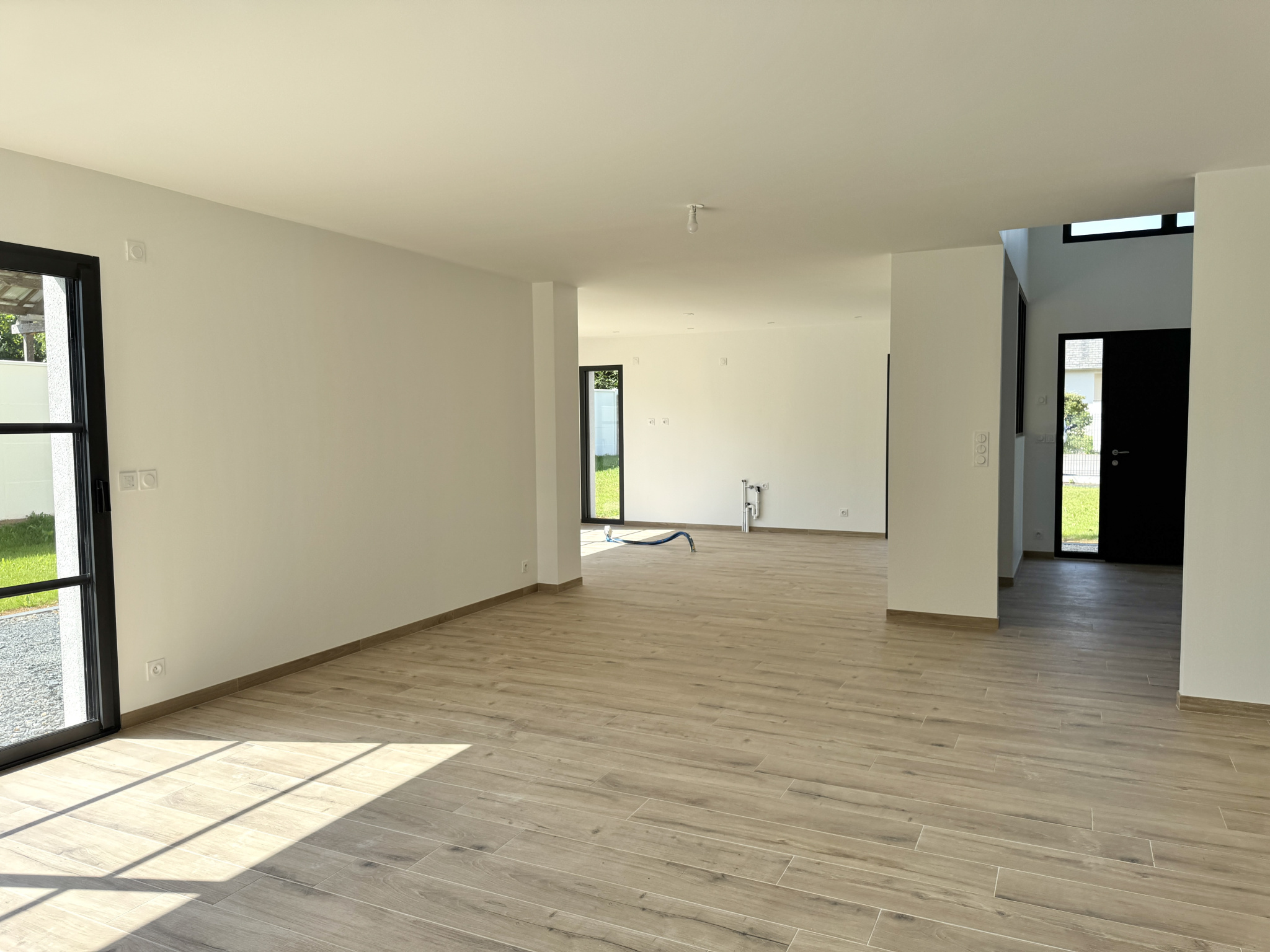 Édifiée sur un terrain clos et engazonné de 728m2, cette maison séduit dès l'entrée par son architecture élégante à toit plat et ses lignes épurées. Dès le hall d'accueil, un grand espace permet l'installation d'un placard pour optimiser le rangement. La luminosité est un atout majeur de cette maison, notamment grâce aux belles ouvertures et à la baie vitrée à galandage qui baigne de lumière la vaste pièce de vie de 55m2. Cet espace convivial intègre une cuisine ouverte, à aménager, avec un emplacement prévu pour un îlot central.