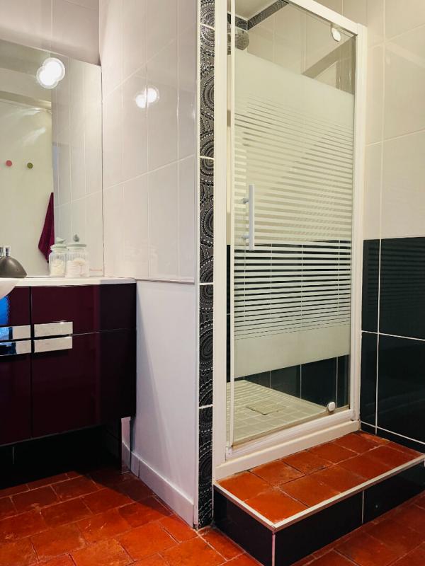 La pièce de vie de 32m² est traversante, elle dessert une charmante suite parentale avec baie vitrée, tomettes et salle de douche ainsi qu'une deuxième chambre en enfilade pouvant aussi être utilisée en dressing ou salle de jeux.