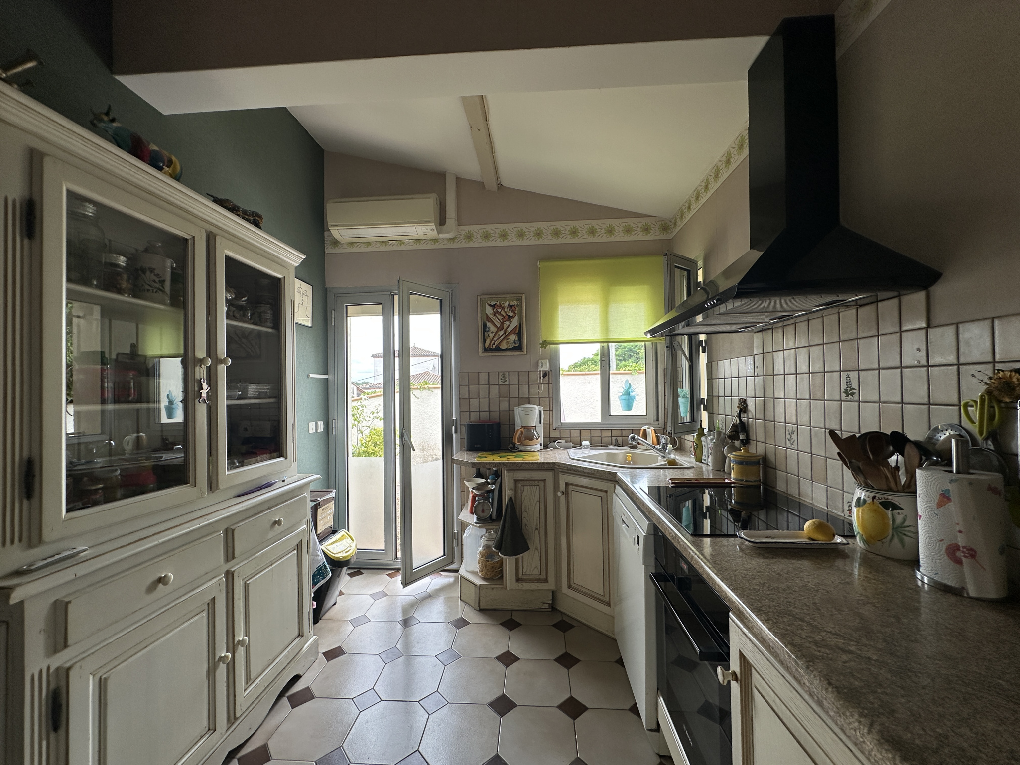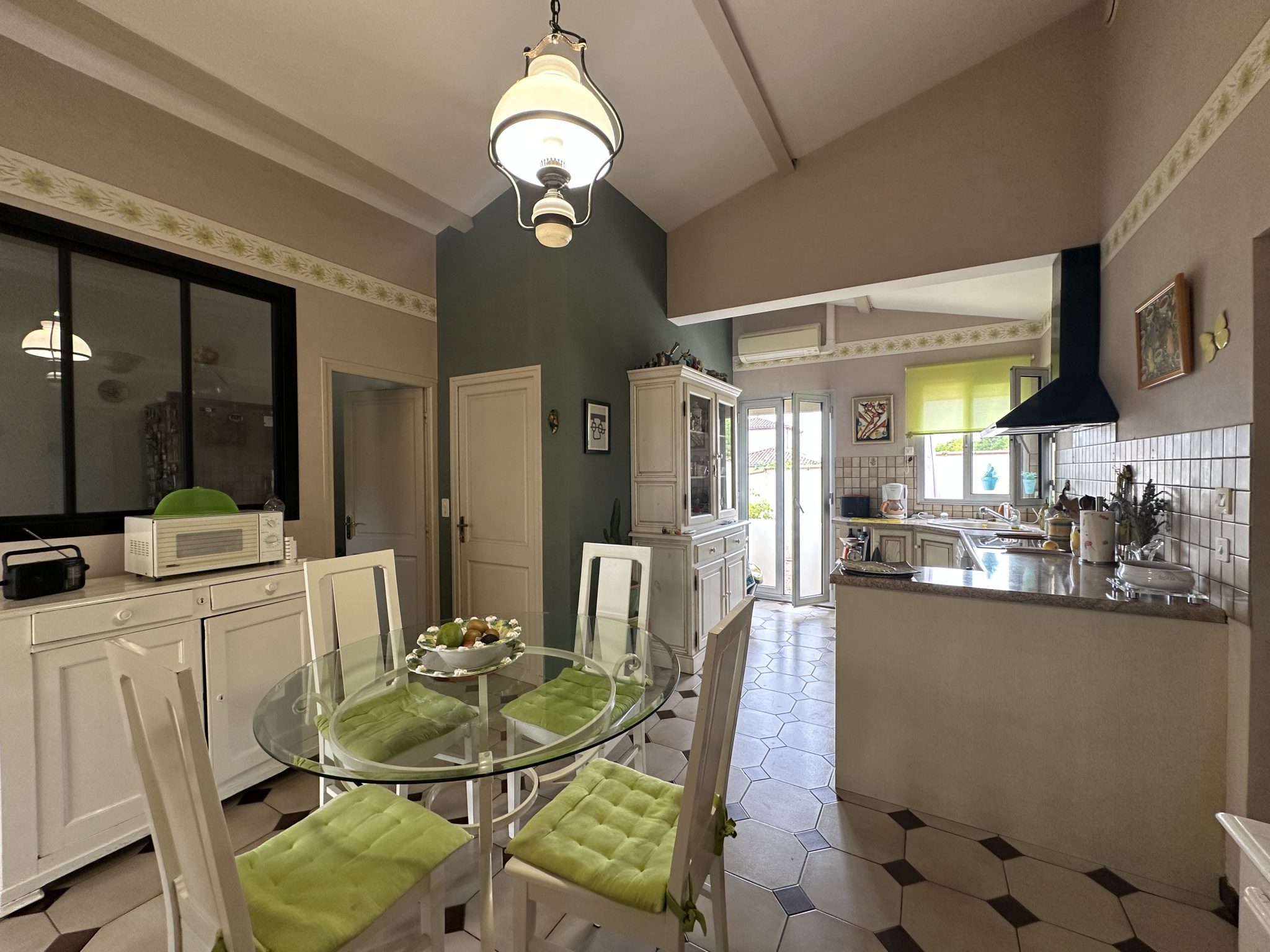 Elle est composée : d'une entrée, d'un vaste salon avec sa cheminée donnant sur une terrasse, une cuisine équipée, une arrière cuisine, une salle à manger, une salle de bains, un wc et deux chambres.