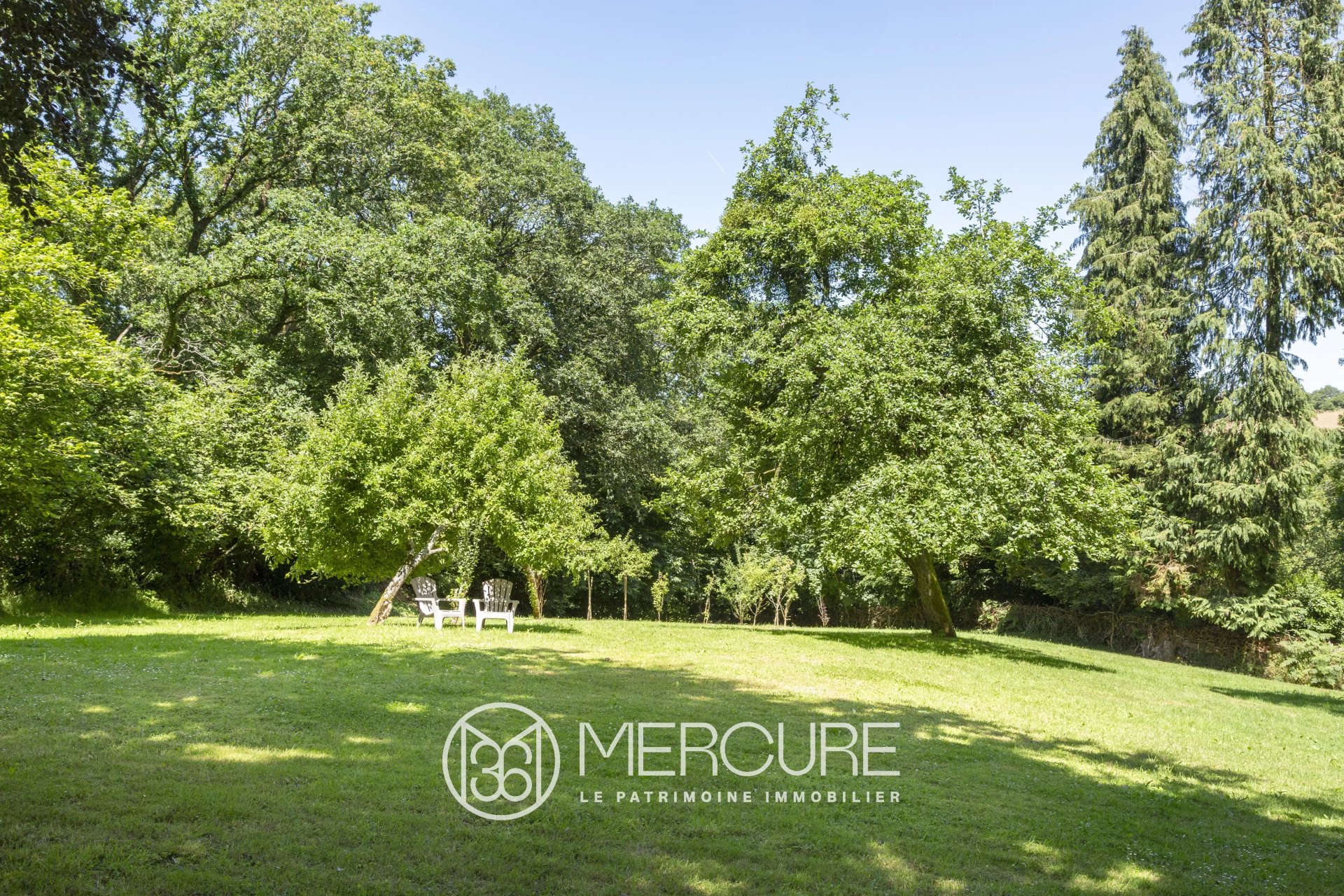 Face à la façade en L du manoir, une vaste terrasse ouvre sur une perspective boisée autour d’un grand cèdre bleu, suivie d’un potager. À l’opposé, un chemin mène à un petit pont enjambant la rivière. Le cadre est à la fois naturel et entretenu, invitant à la sérénité.