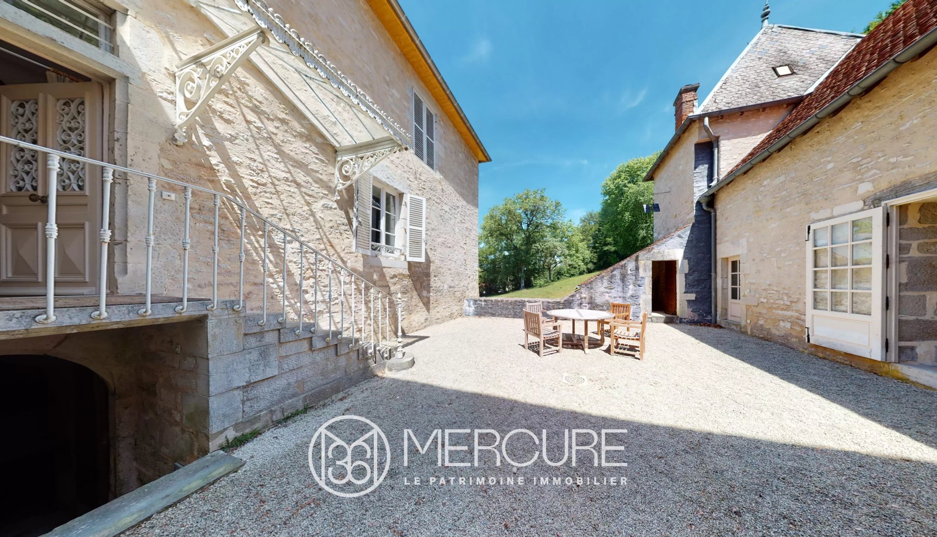 Entre Besançon et Vesoul, sur les hauteurs d’un village dans un environnement vallonné, château dont les origines remontent au XVe, reconstruit au XIXe, sur environ 1,8 hectare de parc avec vue dégagée. Constitué de trois ailes autour d’une cour intérieure, d’environ 315 m² habitables, il comprend une dizaine de pièces principales dont actuellement cinq chambres et trois salles de bains. Pigeonnier, maison de gardiens, garages, communs… Deux autres bâtiments à l’écart du château avec terrains attenants. Beaux volumes, très lumineux, dans un environnement calme et sans nuisance.