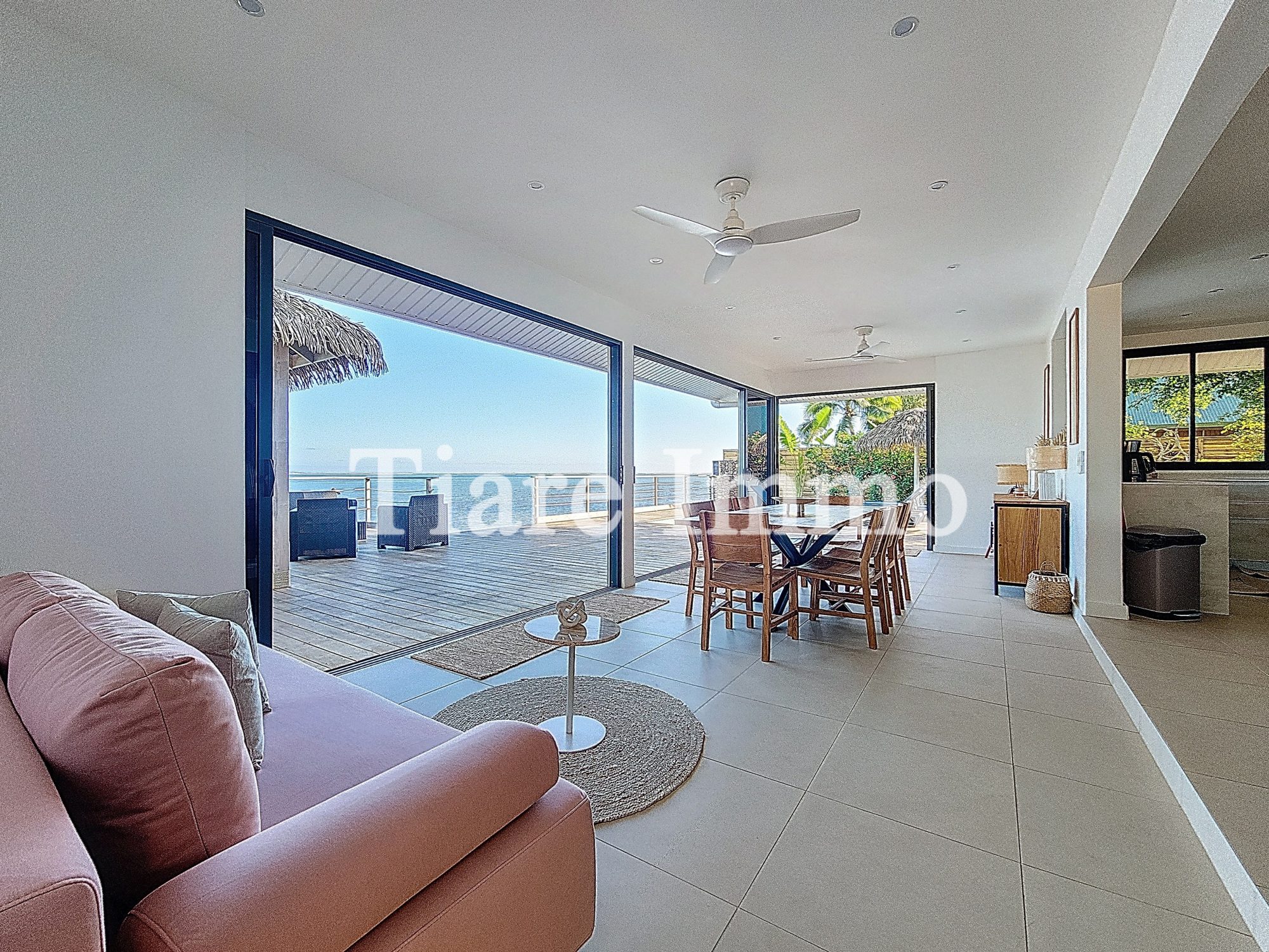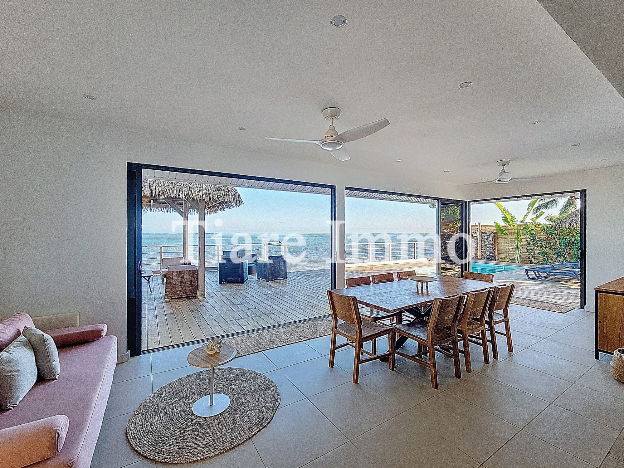 À l'extérieur, le charme continue : terrasse en deck face au lagon, piscine à débordement, faré pote'e panoramique, accès direct à l'eau, et même la possibilité d'amarrer un petit bateau (tirant d'eau < 60 cm).