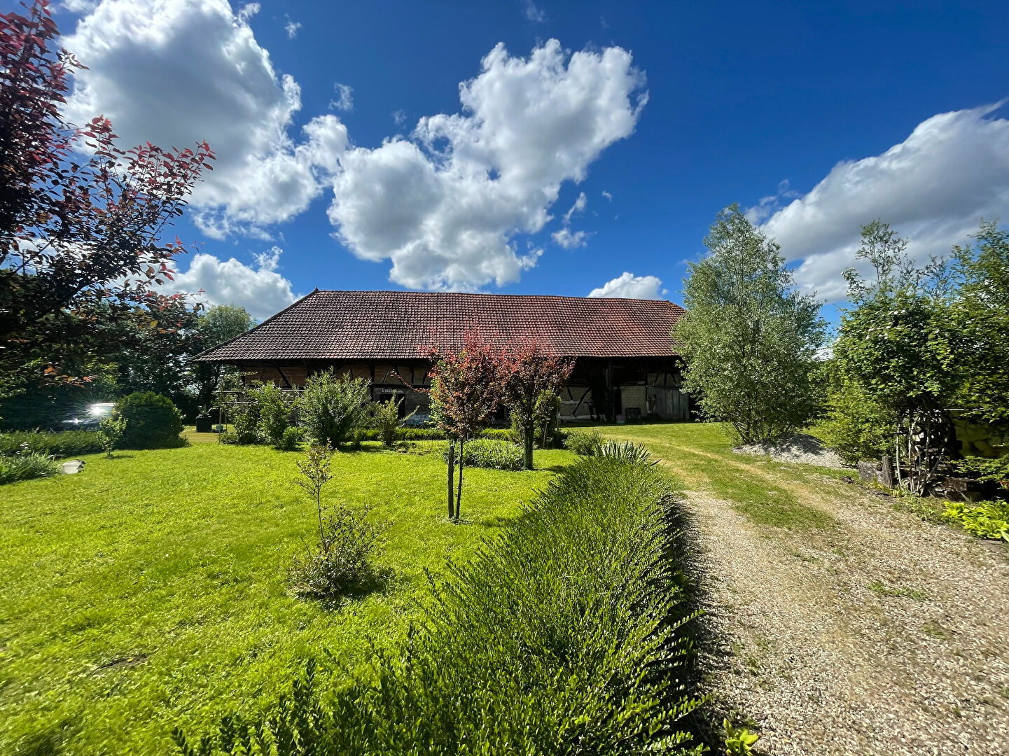 Corps de ferme bressan, situé au calme et sans vis-à-vis, comprenant une ferme d'habitation sur 90 m² habitable, une cuisine équipée, un salon avec un poêle à pellets, une salle à manger avec un poêle à bois et jolies tommettes au sol, deux chambres, une salle d'eau, un wc, dégagement avec lave-mains, deux remises, un atelier, un grenier ; adoucisseur d'eau. Un bâtiment d'hébergeage indépendant avec grange, écuries et remises. Un autre bâtiment avec tecks, local poubelle, bûcher et remises. Le tout sur un terrain joliment arboré et clos avec mare, verger et deux puits sur 8389 m².