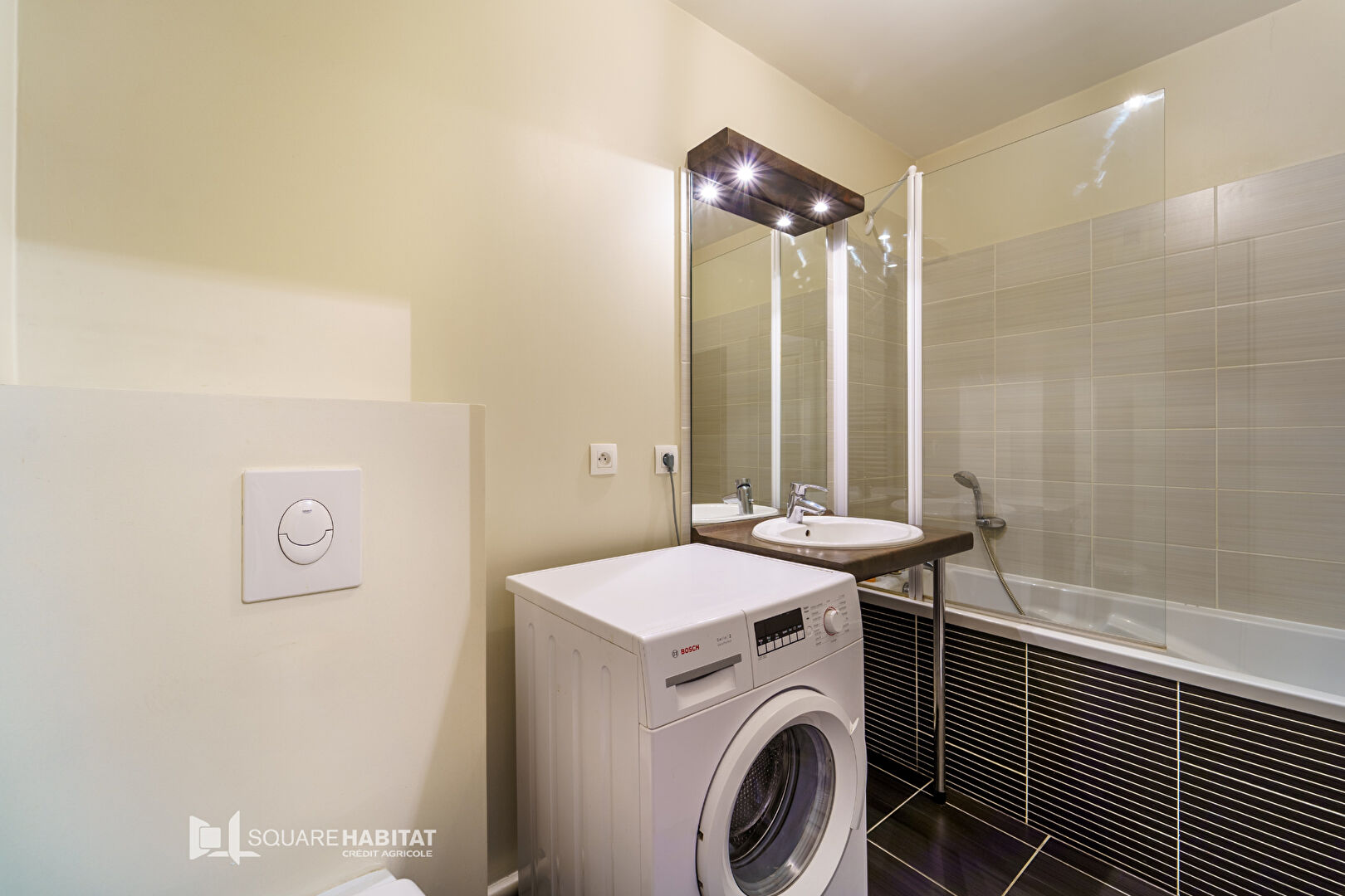 Dans superbe résidence de grand Standing "SEGER" de 2011, Appartement T1 Bis comprenant une entrée avec placard, une cuisine aménagée et équipée (plaque vitro, frigo, hotte) ouverte sur le séjour, un coin nuit avec placard, une salle de bains avec wc.
