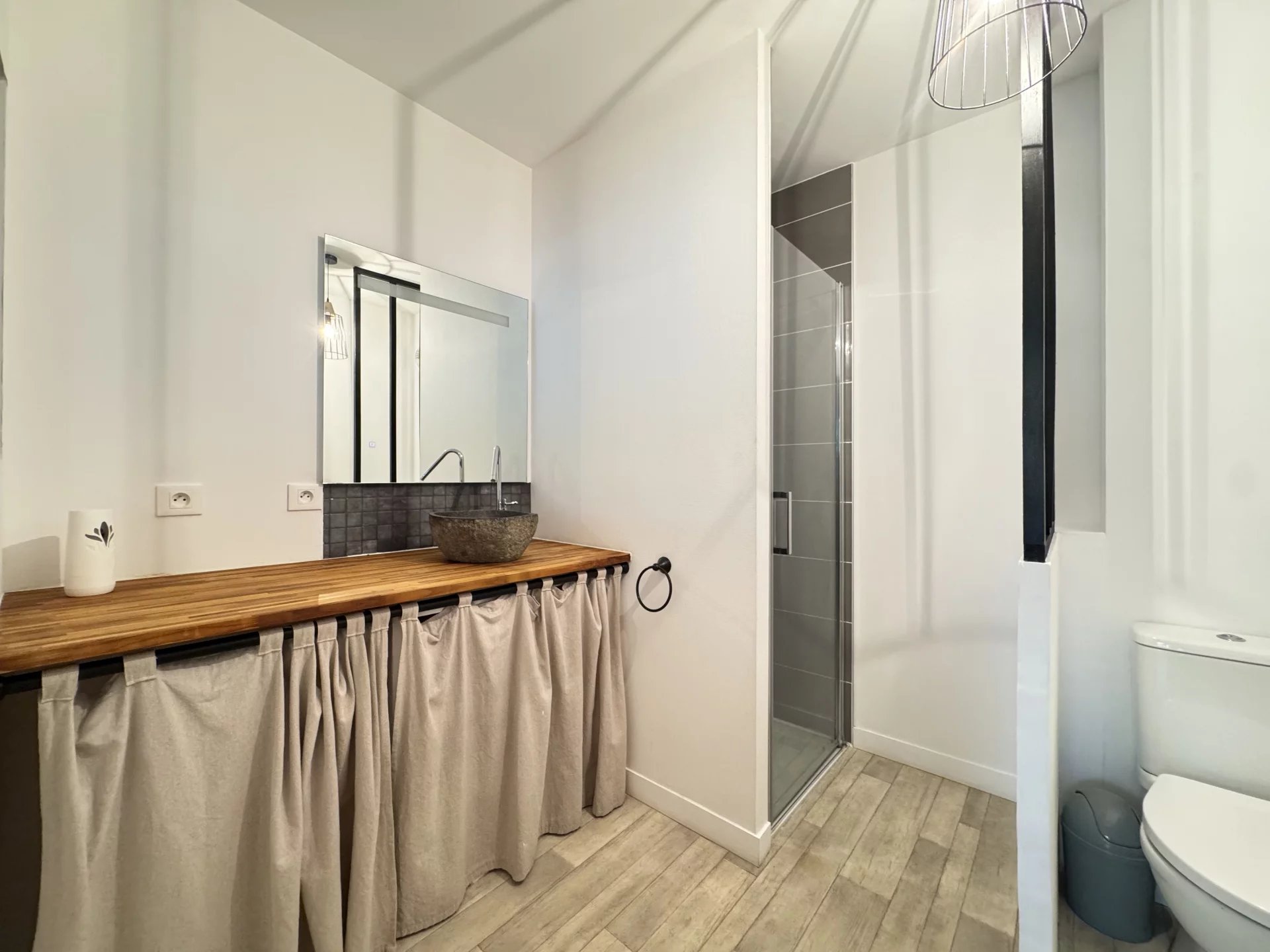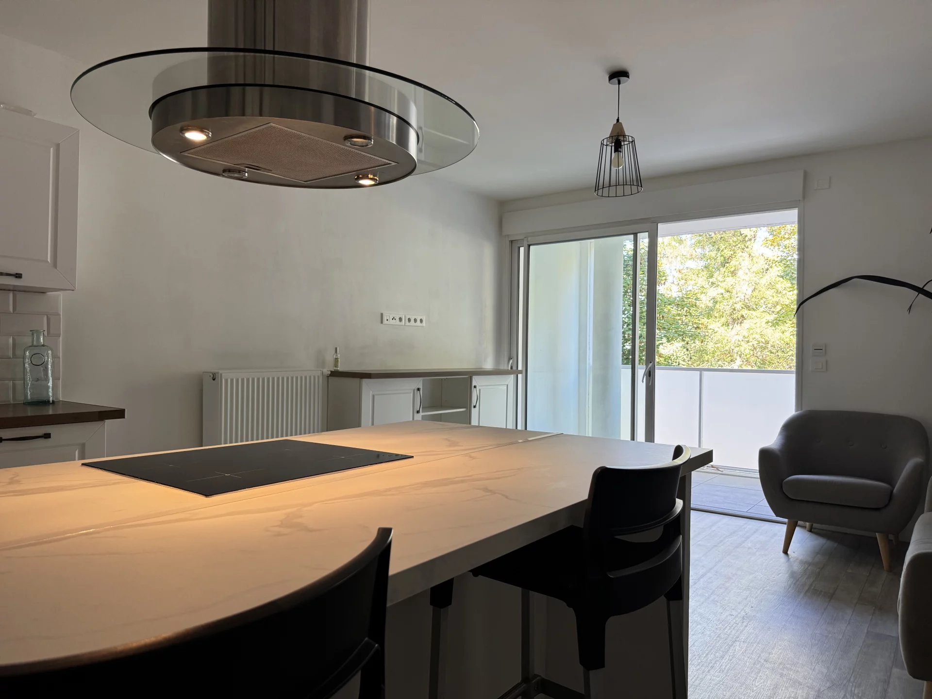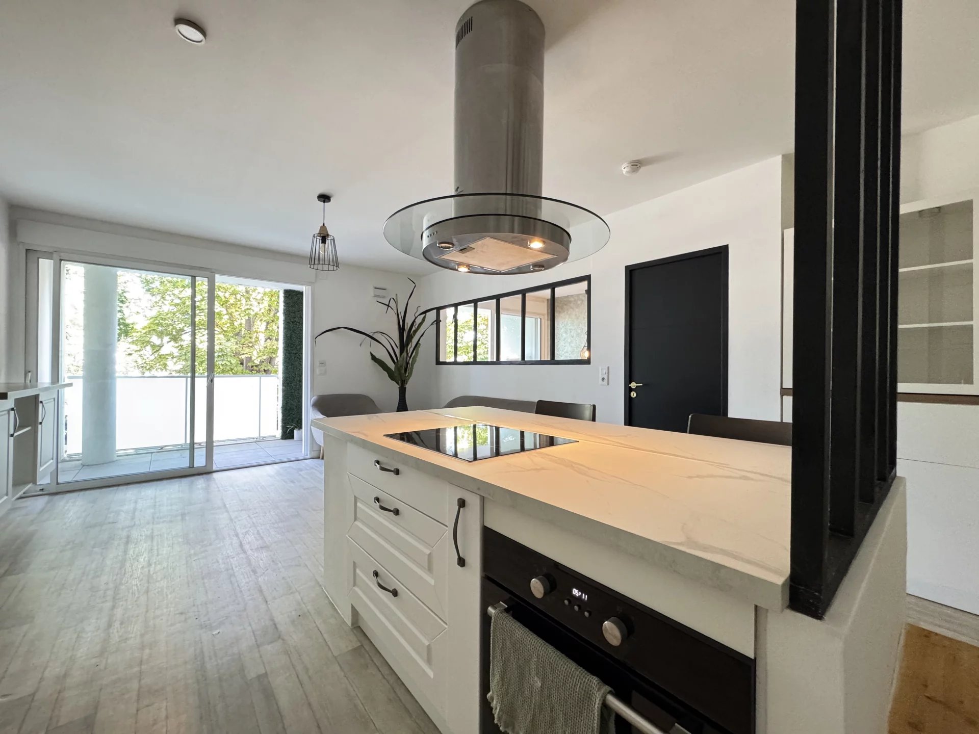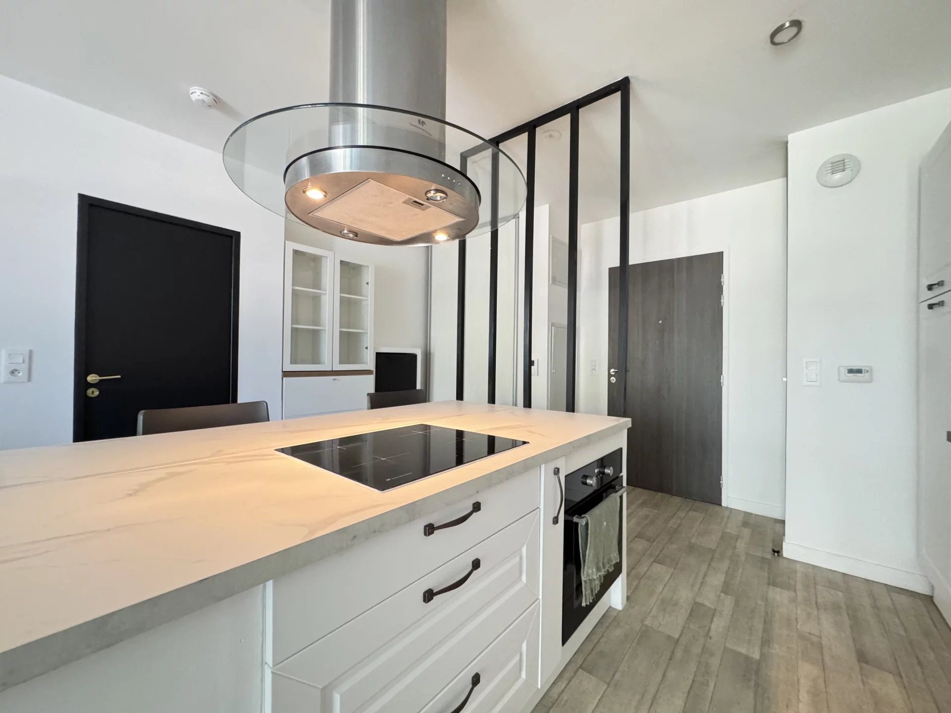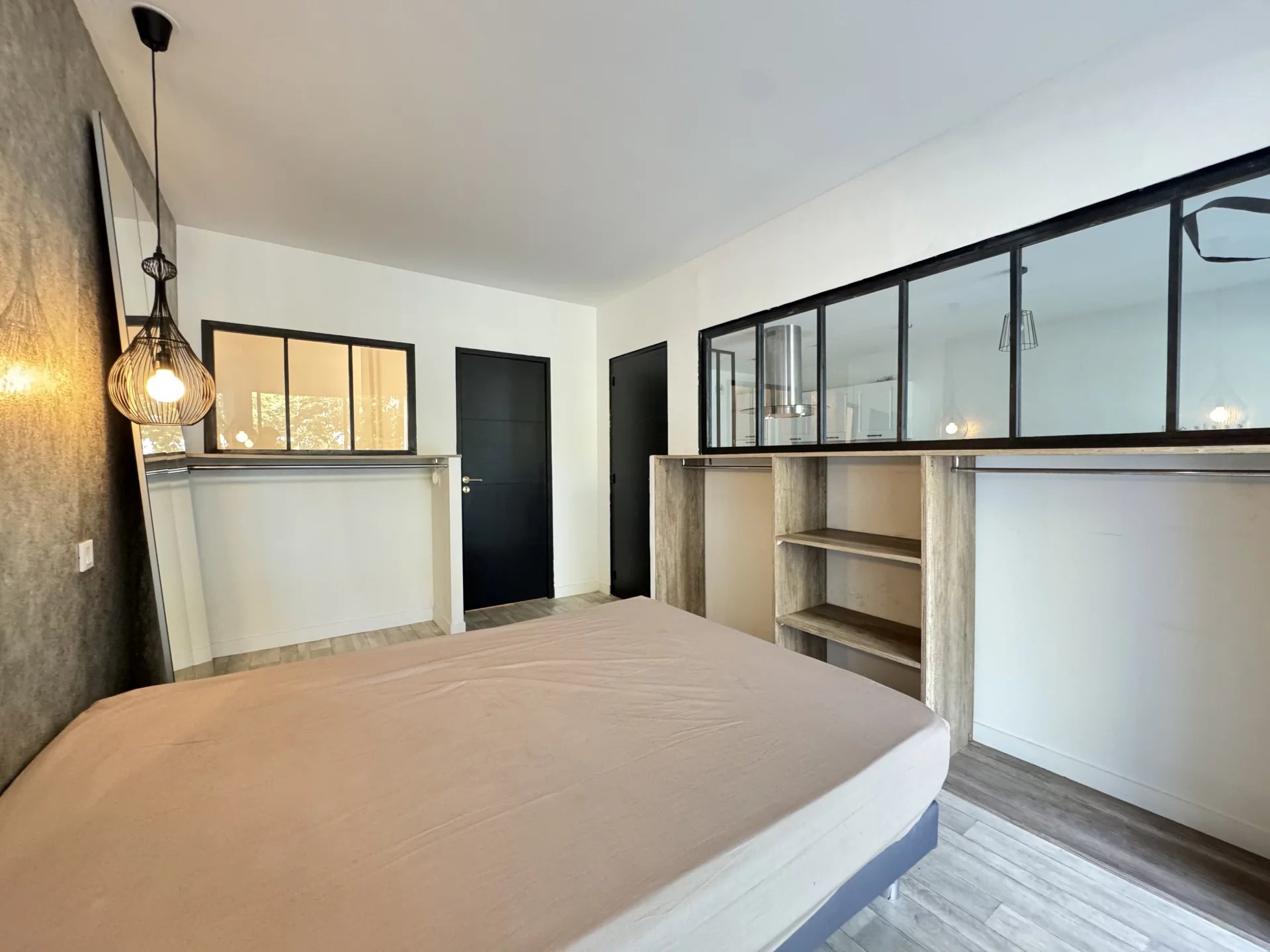 La partie cuisine du séjour de 28m² est aménagée avec un îlot central vous permettant de prendre les repas et la chambre est équipée d'un grand rangement.