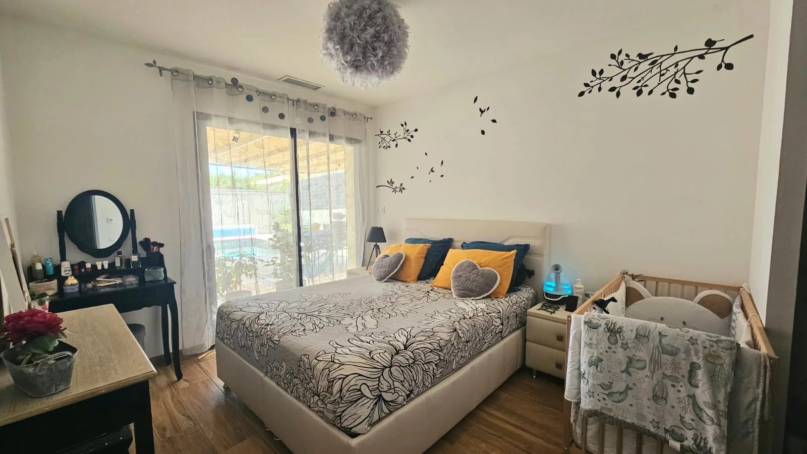Elle est composée d'un hall d'entrée avec placards aménagés, d'un dégagement, d'un grand cellier, de toilettes indépendants, de 3 chambres dont une suite parentale avec dressing aménagé et salle d'eau ajourée, une salle de bains ajourée (avec baignoire et douche) et d'une spacieuse pièce de vie avec cuisine ouverte donnant sur terrasse, jardin et piscine.