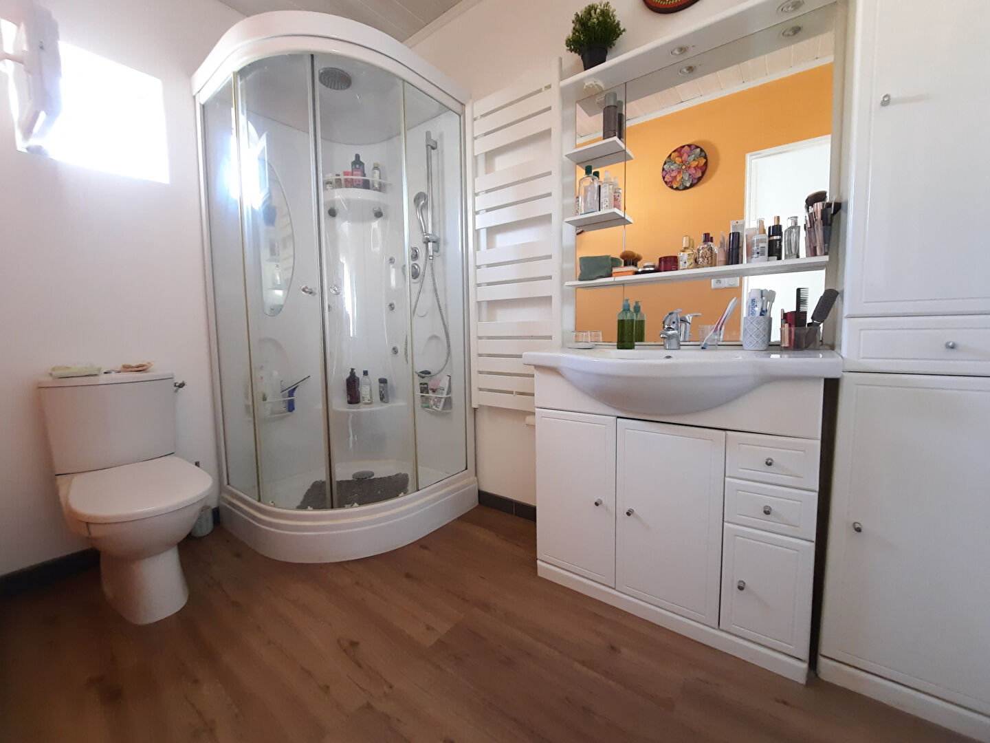 Elle propose au rdc : une entrée avec placard, une pièce de vie donnant accès à une belle terrasse d'environ 40m², cuisine A/E, un espace buanderie, une salle d'eau avec WC.