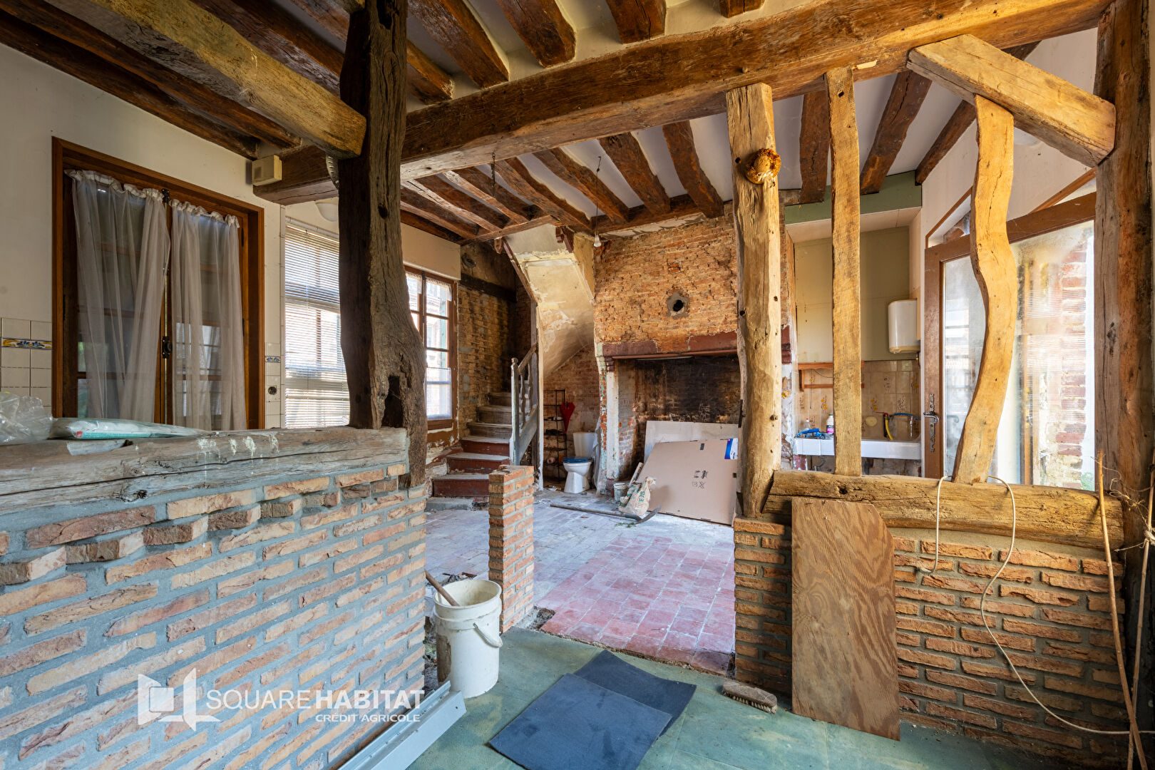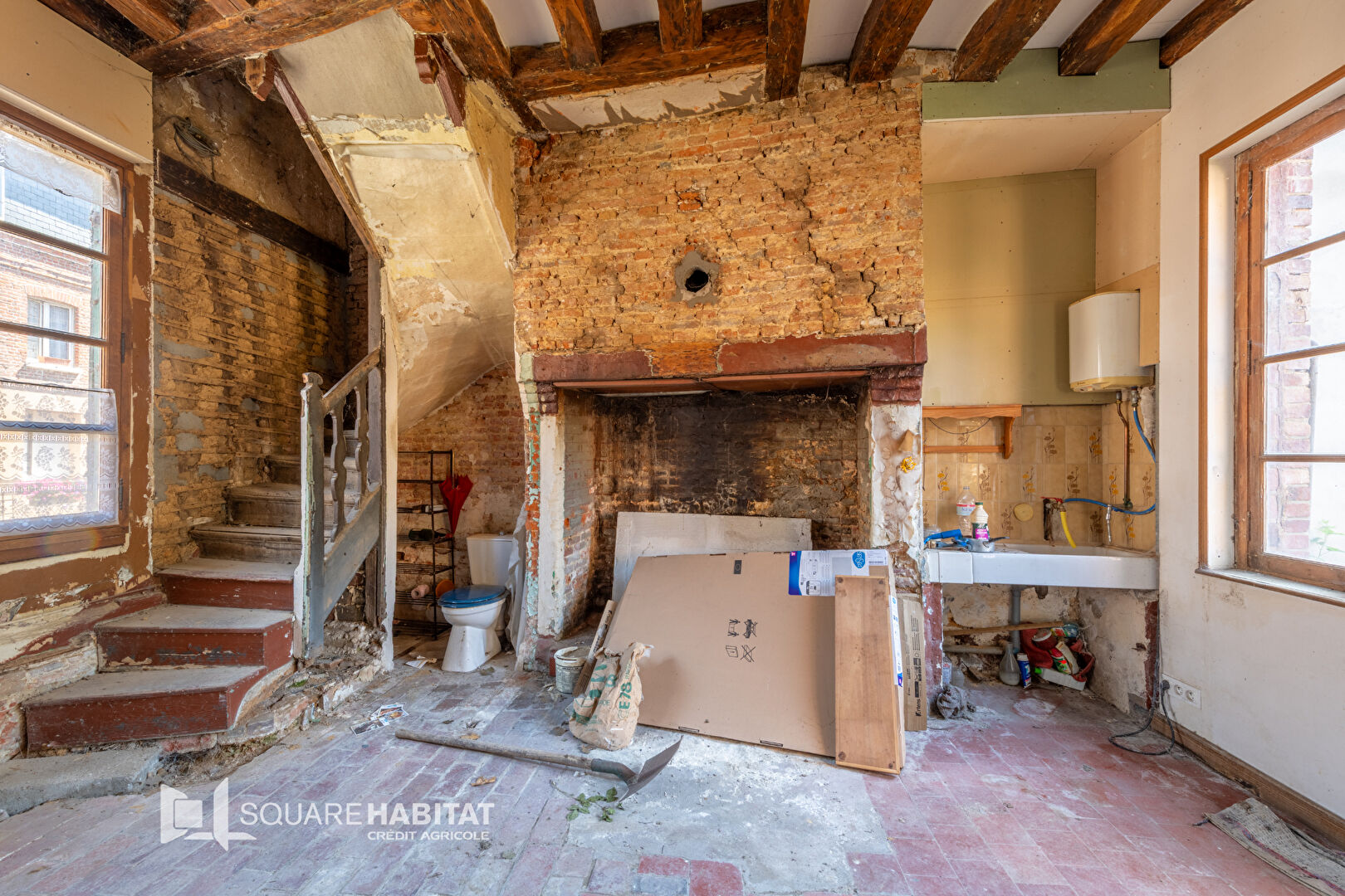 Au rez-de-chaussée : pièce à vivre avec cheminée ouverte, coin cuisine et WC.