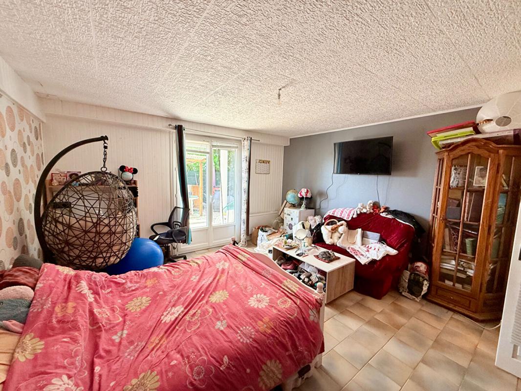Le salon lumineux, exposé plein sud, s'ouvre sur l'extérieur, tandis que la cuisine aménagée et équipée est prête à être utilisée.