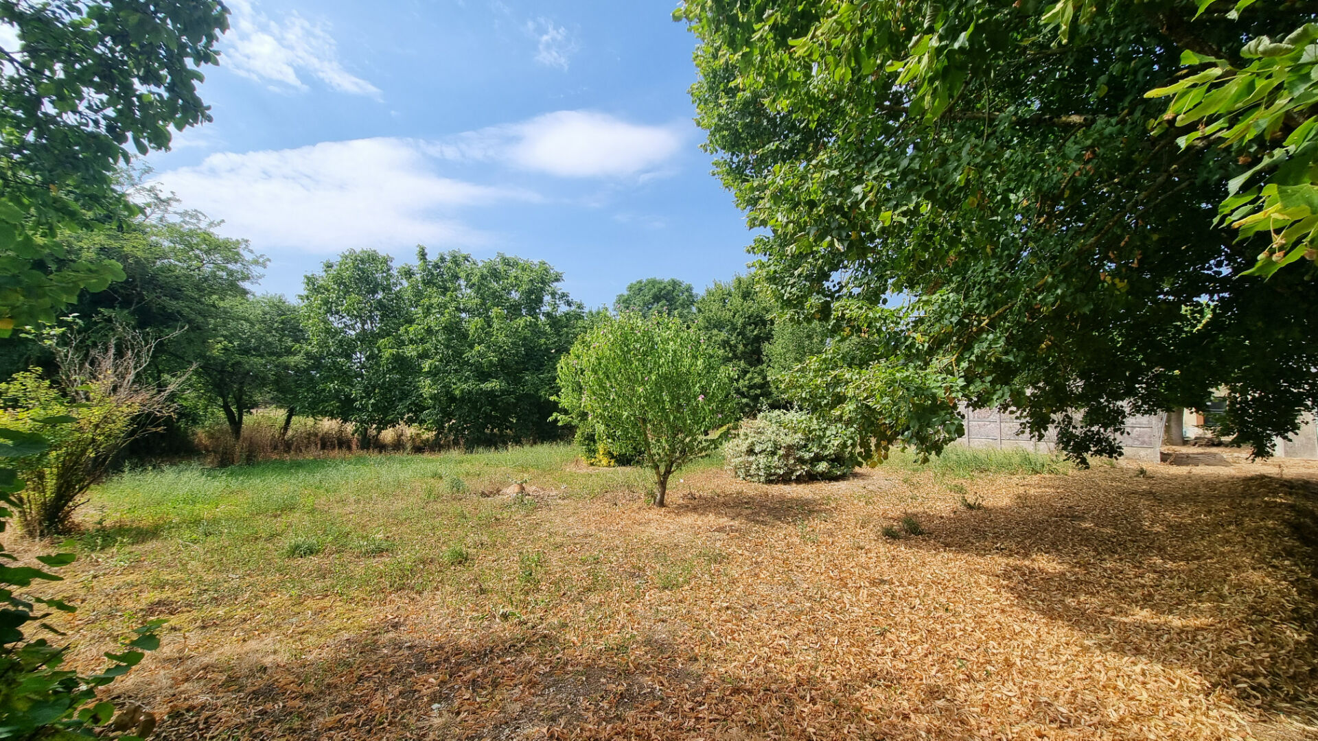 Grand terrain de 2700m² derrière la maison avec garage et dépendances.