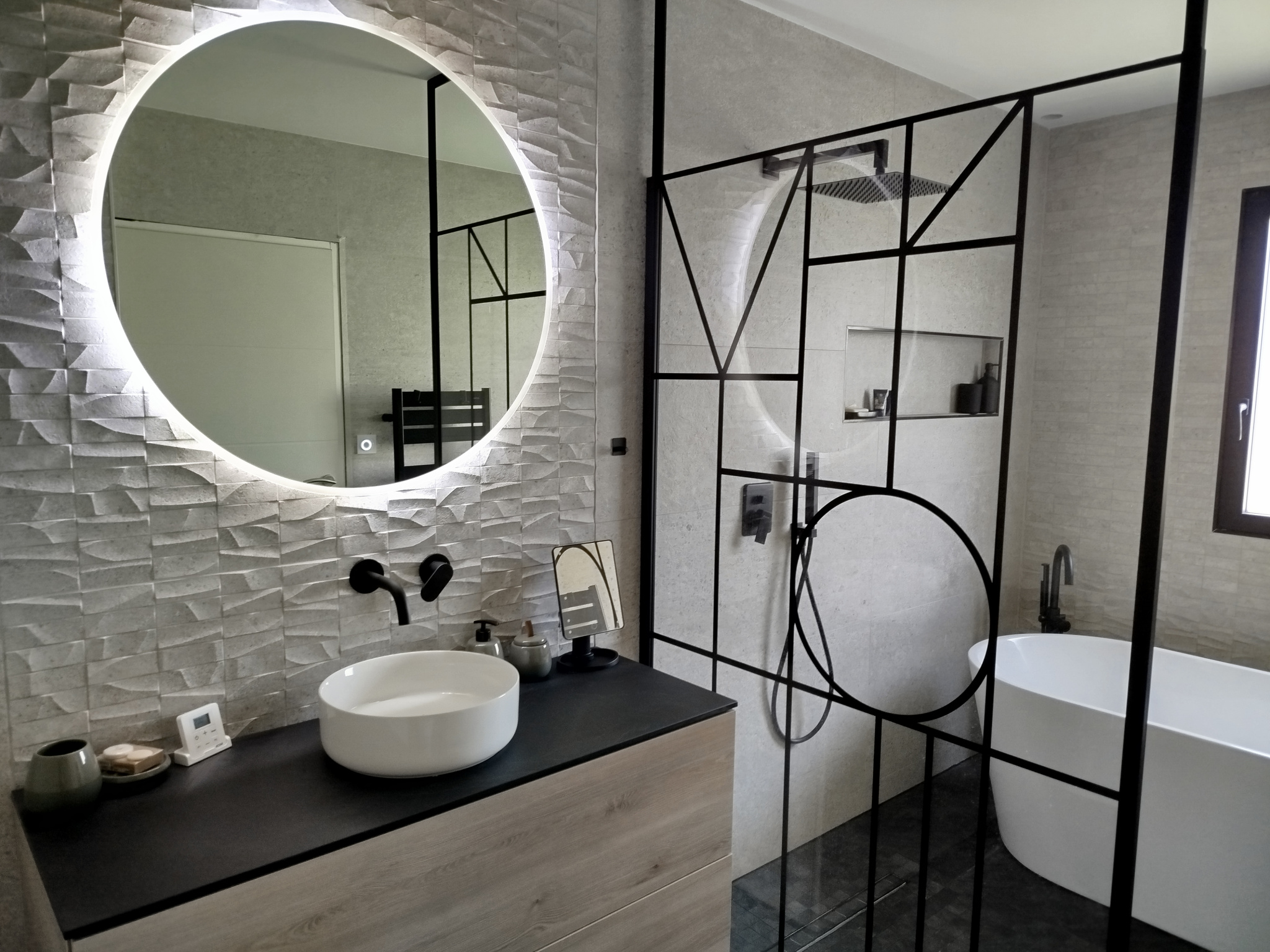 Un vaste salon/séjour lumineux de 50 m2 avec un espace bureau idéal pour le télétravail ou les activités personnelles, une suite parentale avec salle de bain, wc et dressing