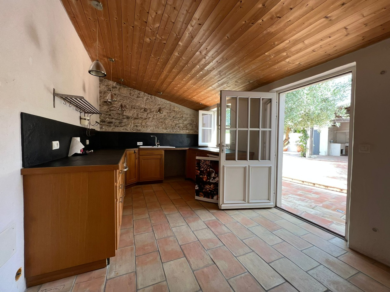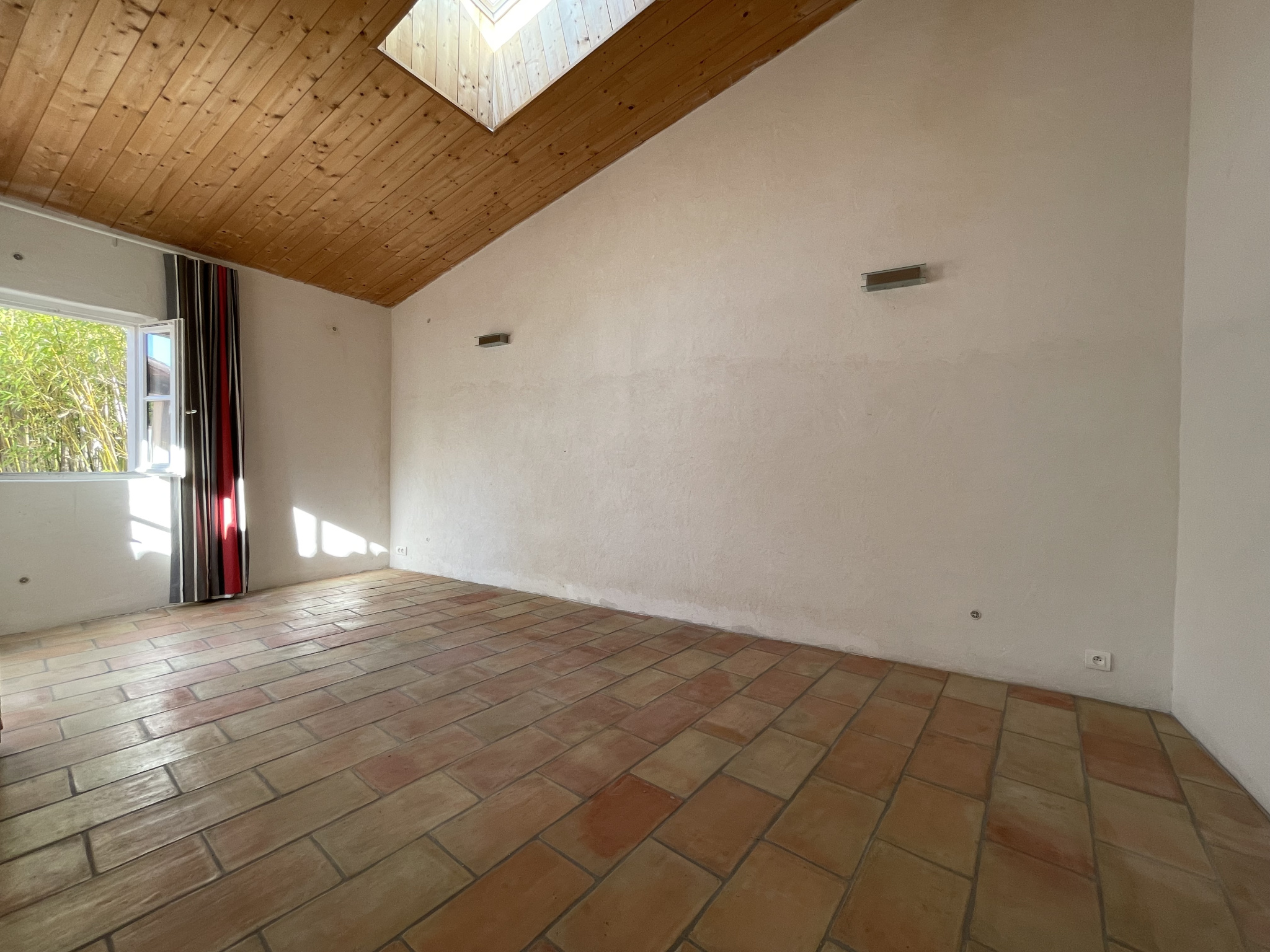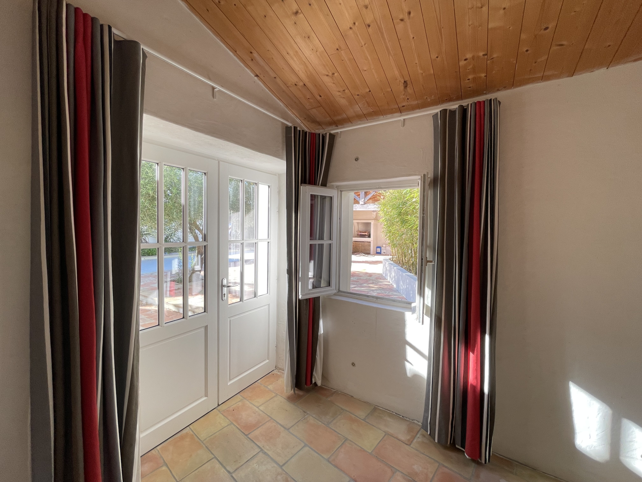 Au rez-de-chaussée : salon avec cheminée, chambre avec salle de bains attenante, salle à manger avec cuisine à l'américaine équipée (plaque, four) ouvrant sur terrasse et auvent avec barbecue et PISCINE traditionnelle de 9x4 m chauffée.