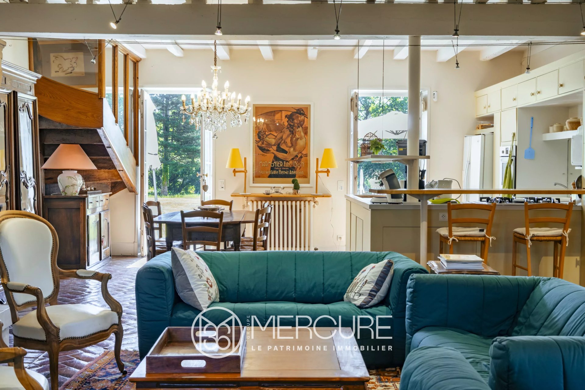 D’une surface habitable d’environ 350 m², la maison principale se déploie sur trois niveaux. Le rez-de-chaussée, lumineux et traversant, mêle authenticité et convivialité : cuisine ouverte sur un spacieux séjour avec cheminée monumentale, salon XIX?, lingerie, cellier et vestiaire aménagé dans l’ancien four à pain. Les sols en carrons bressans, magnifiquement conservés, confèrent à l’ensemble un cachet régional indéniable.
