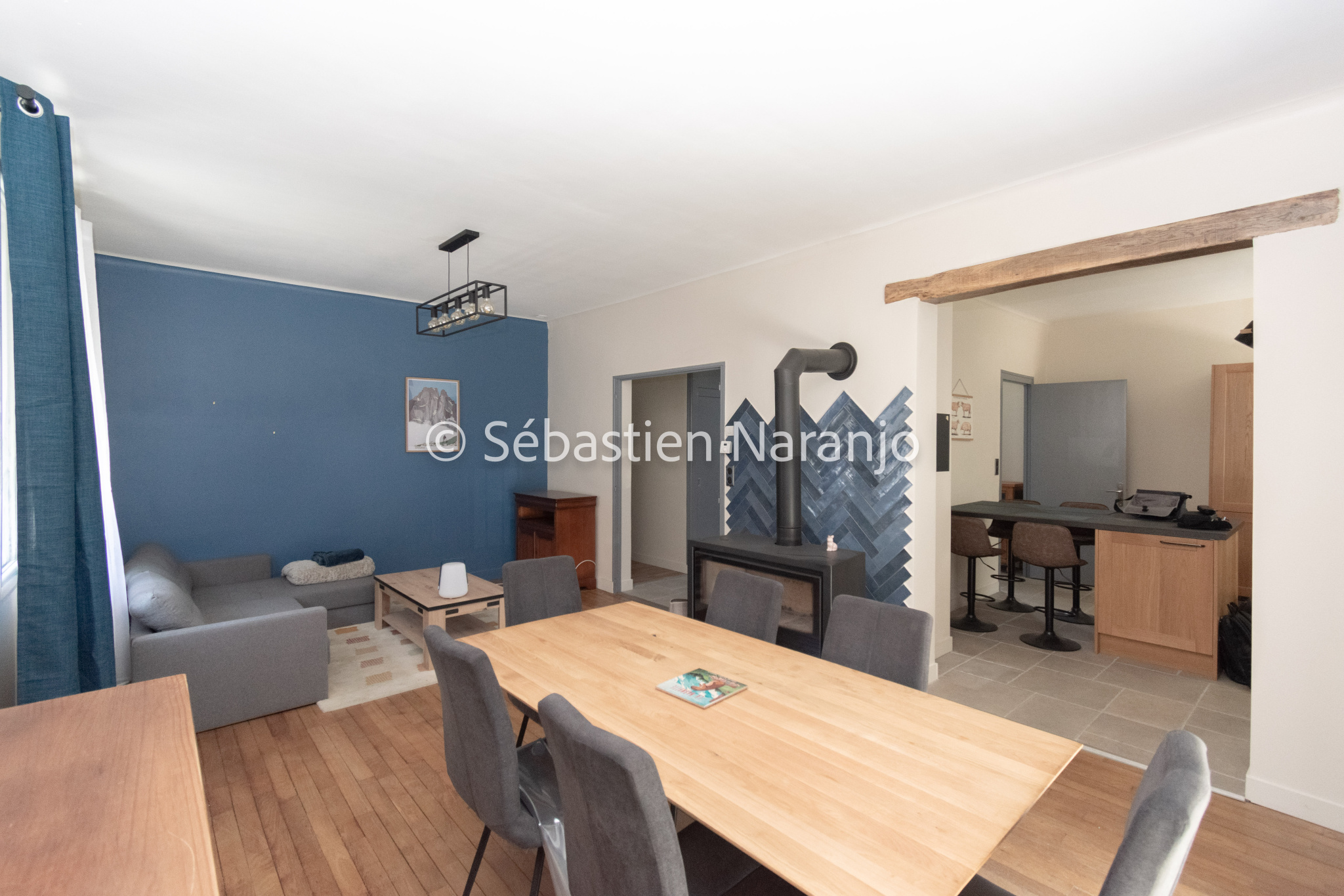 L'espace de vie principal se situe à l'étage et comprend trois chambres, une cuisine récente, aménagée et équipée, ouverte sur la pièce de vie, ainsi qu'un salon doté d'un poêle à bois, avec accès direct à un balcon. Une salle de bain rénovée et des WC séparés complètent ce niveau.