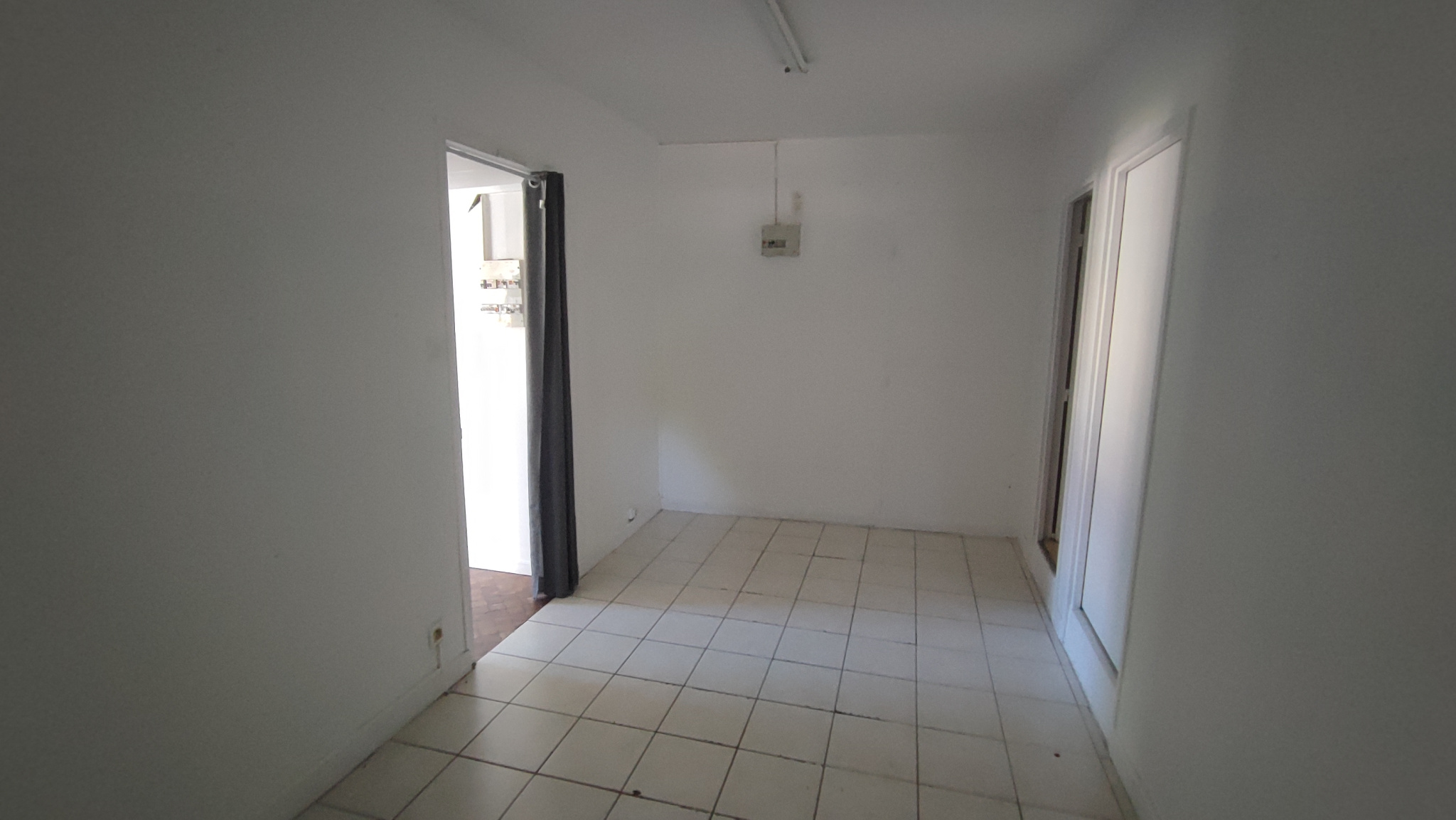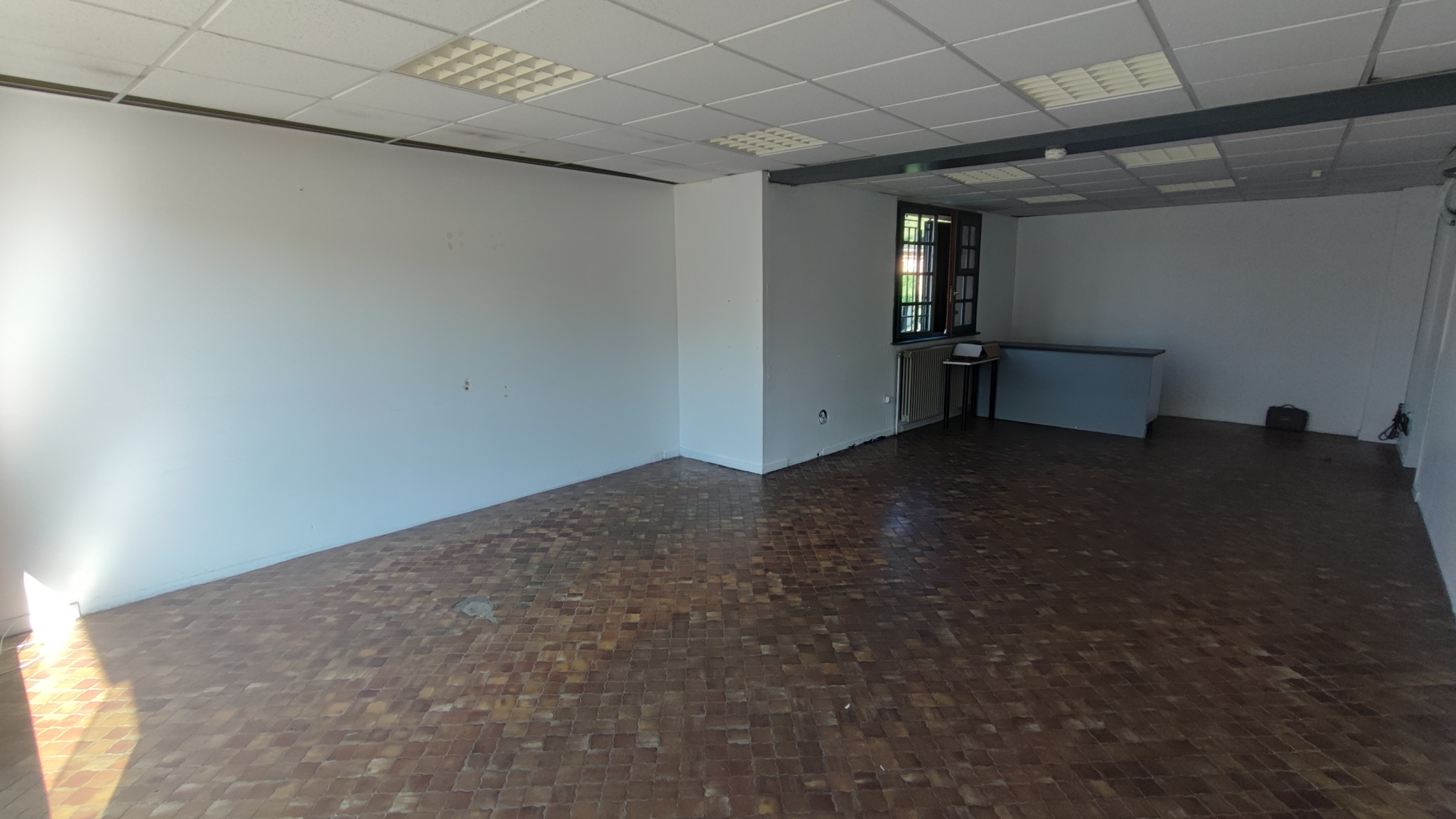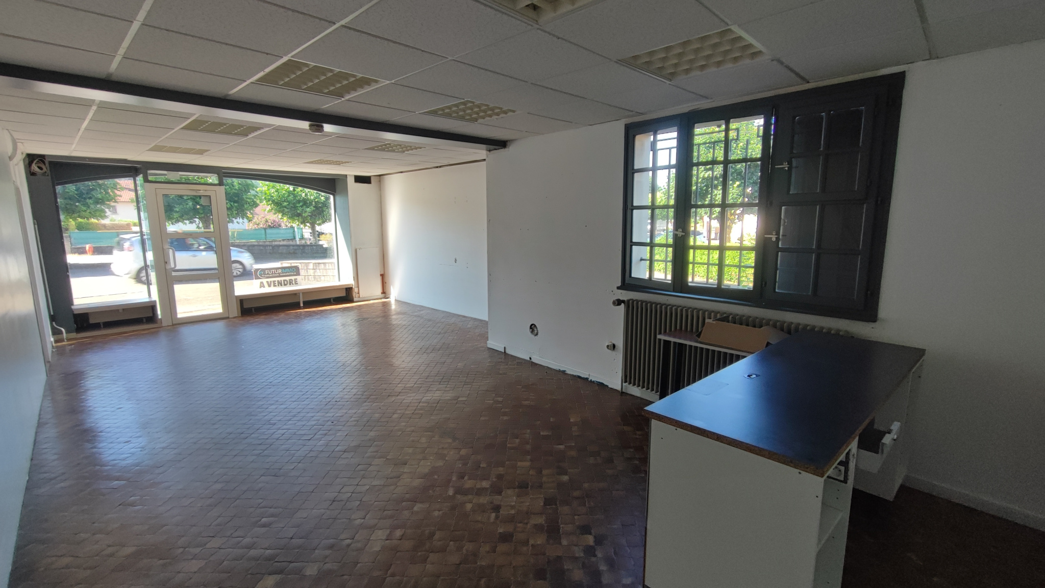 Entrée sur Baies vitrées (Verre sécurit) grande pièce 40m2 env. - 1 Bureau - 2 réserves (1ère réserve avec accès sur WC et lave-mains) 2ème réserve : Stockage.