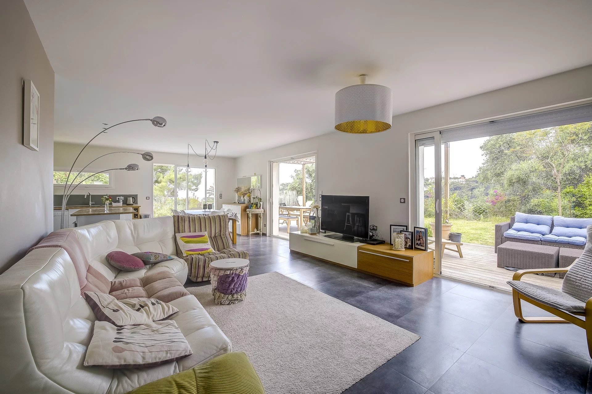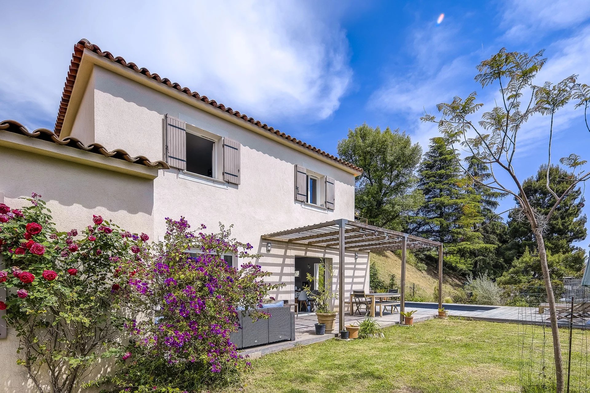 Construction récente (sous garantie décennale), 4 chambres, 2 salles d’eau, piscine, stationnements, environnement calme, vue dégagée avec aperçu mer.
