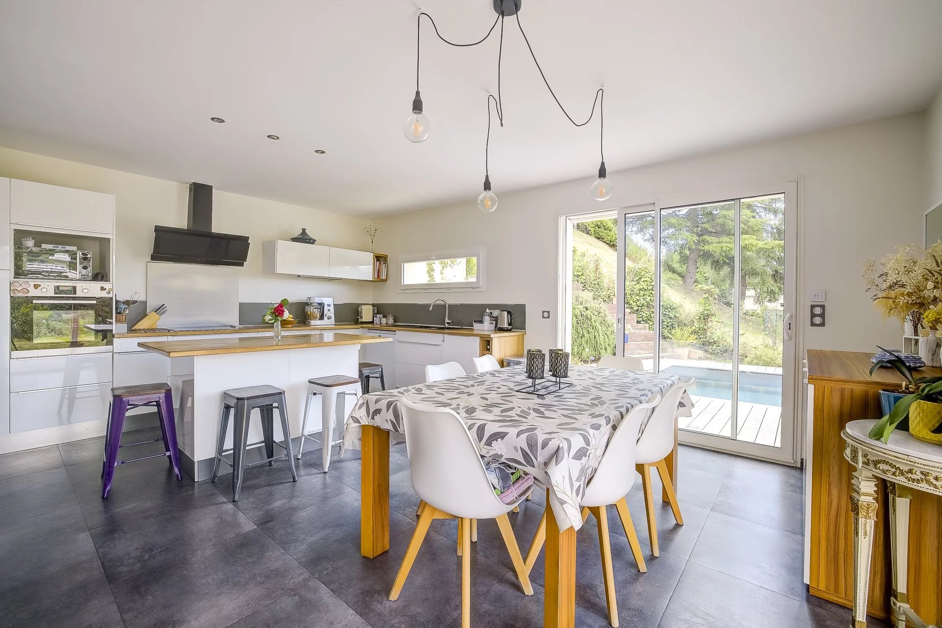 Au rez-de-chaussée : Une chambre de plain-pied, une salle d’eau, un WC indépendants, un vaste séjour de 48 m² avec cuisine ouverte, donnant sur une terrasse ensoleillée et une piscine.