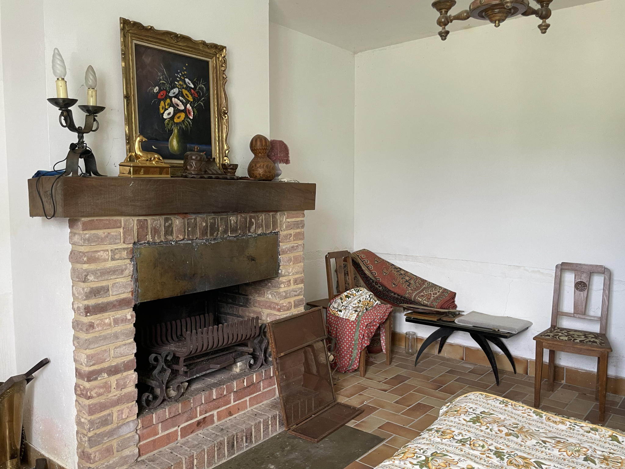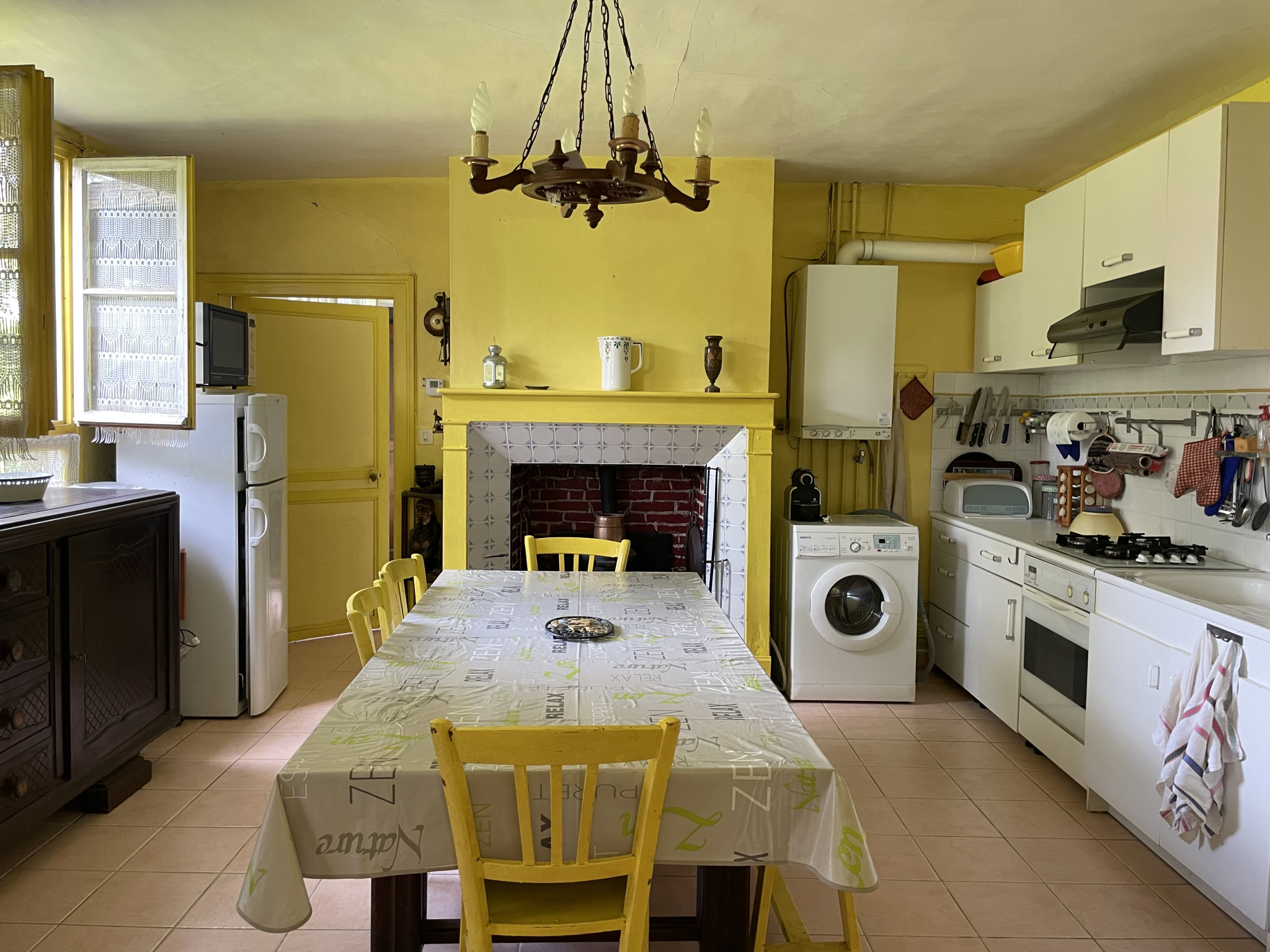 Cette maison ancienne offre au rdc: une cuisine avec espace repas, salon avec cheminée, 1 chambre, salle de bains avec wc.