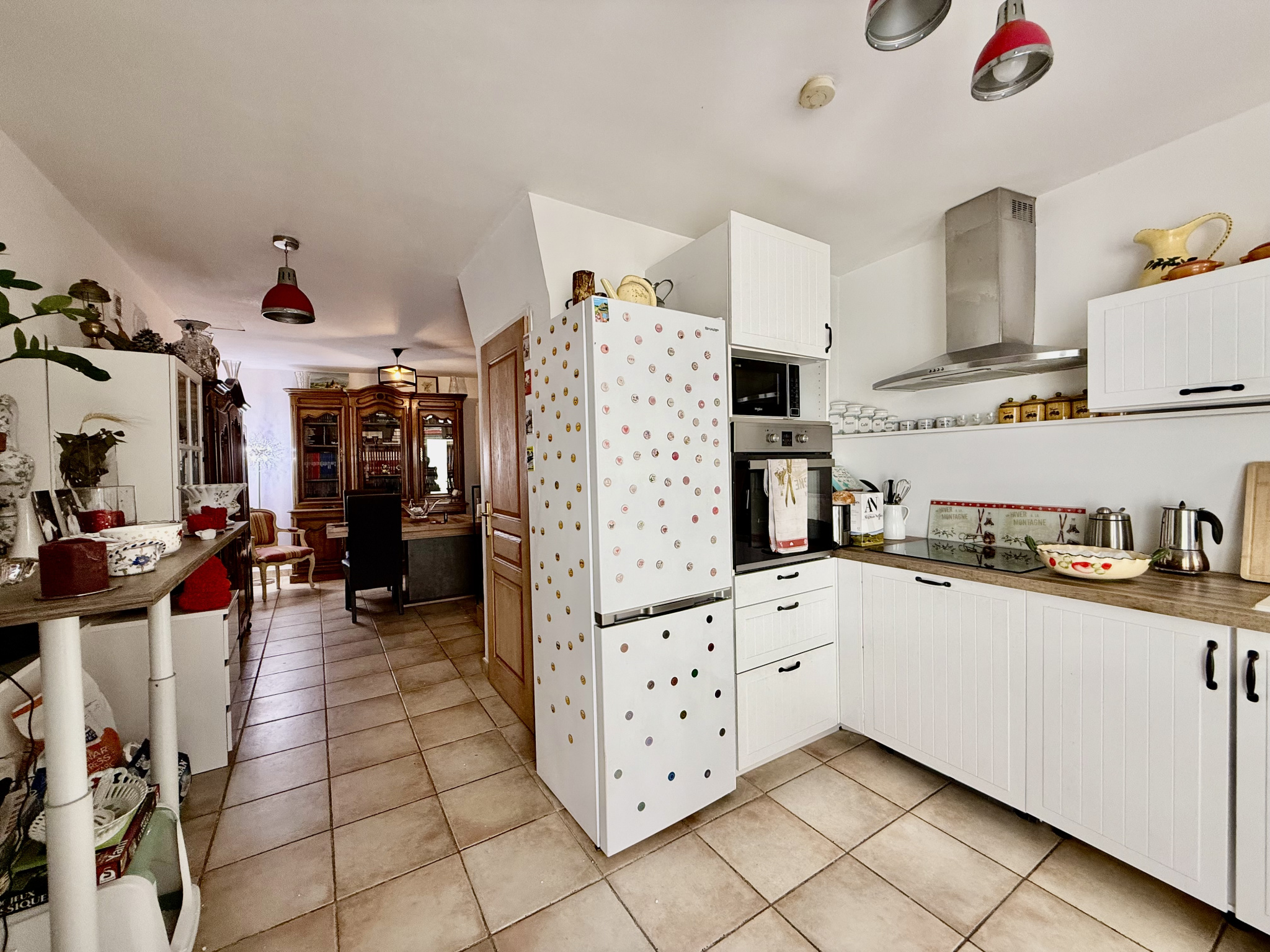 Développée sur trois niveaux, elle propose en rez-de-chaussée une cuisine aménagée refaite à neuf, ouverte sur un salon-séjour chaleureux. On y retrouve également un WC séparé et un escalier quart-tournant, lui aussi entièrement rénové, permettant d'accéder aux étages.