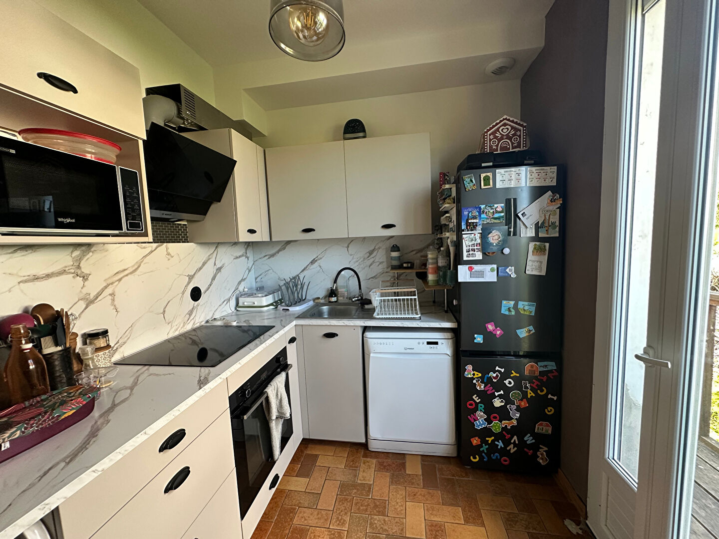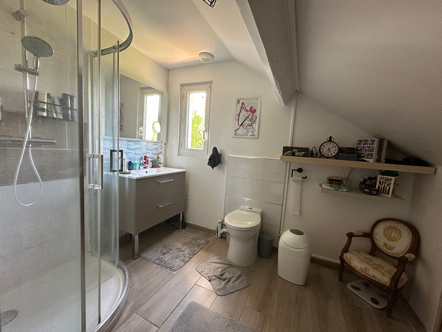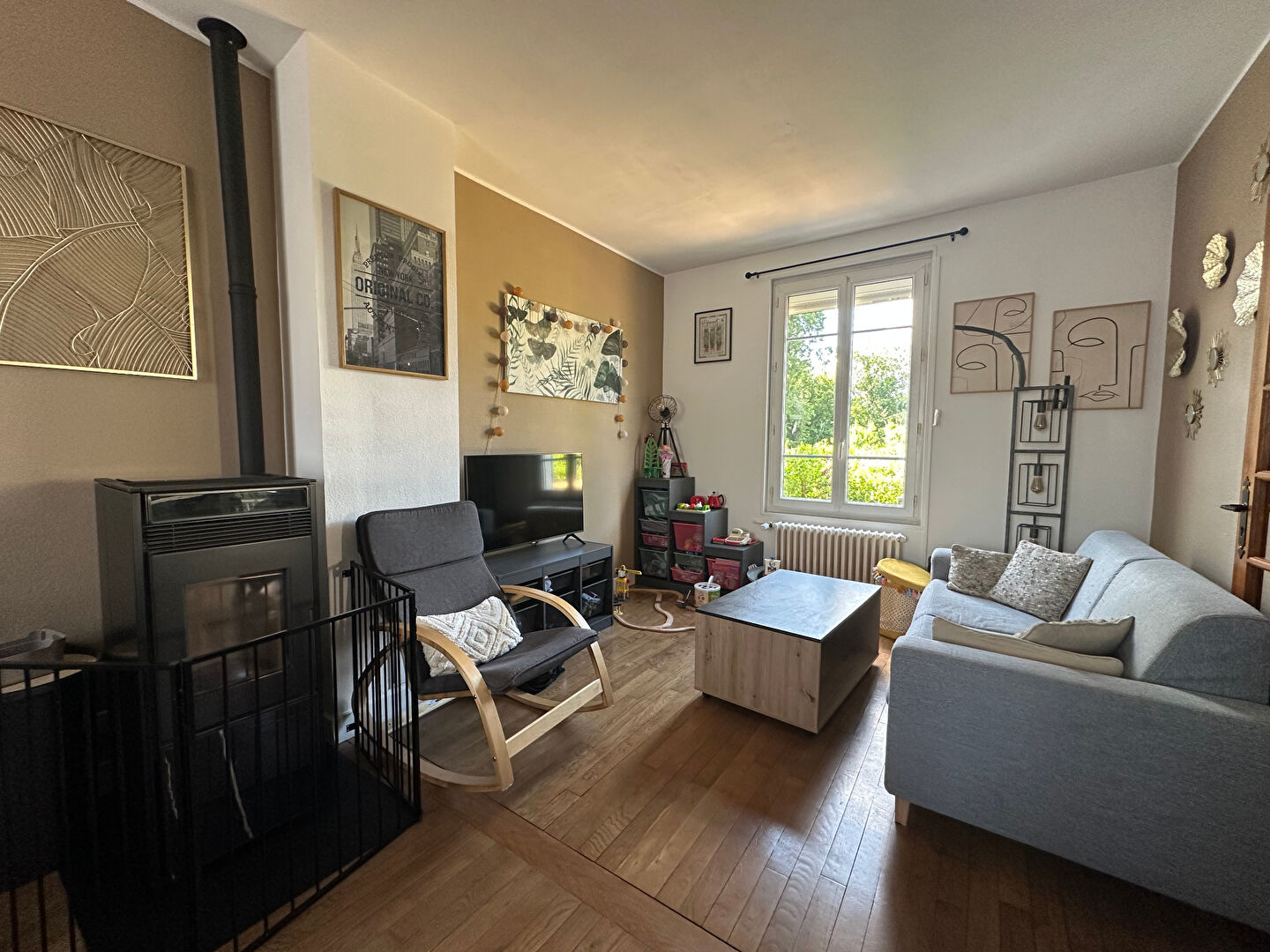 Elle se compose d'un séjour-salon double avec lumière traversante, agrémenté d'un poêle à pellets qui apporte une atmosphère chaleureuse. La cuisine aménagée, fonctionnelle et conviviale, offre un accès direct à une belle terrasse donnant sur un jardin, idéal pour profiter des beaux jours. L'espace nuit comprend deux chambres, dont une avec dressing ainsi qu'une salle d'eau.