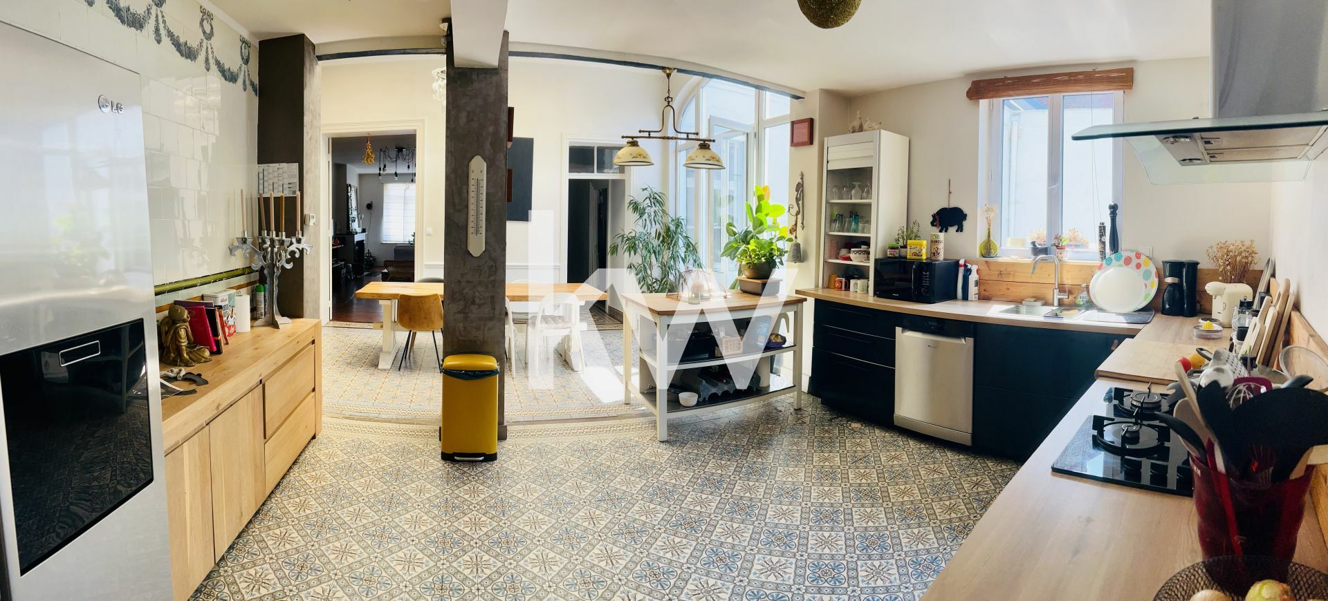 Au rez-de-chaussée, vous trouverez , une grande cuisine ouverte sur la salle à manger, agrémentée d'une ancienne verrière apportant luminosité et élégance.